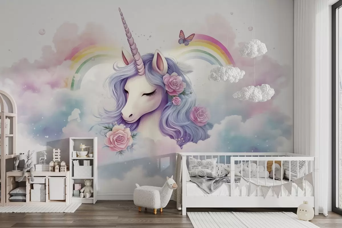 Фототапет Пастелен еднорог в облаците с дъга и рози Nr w03990