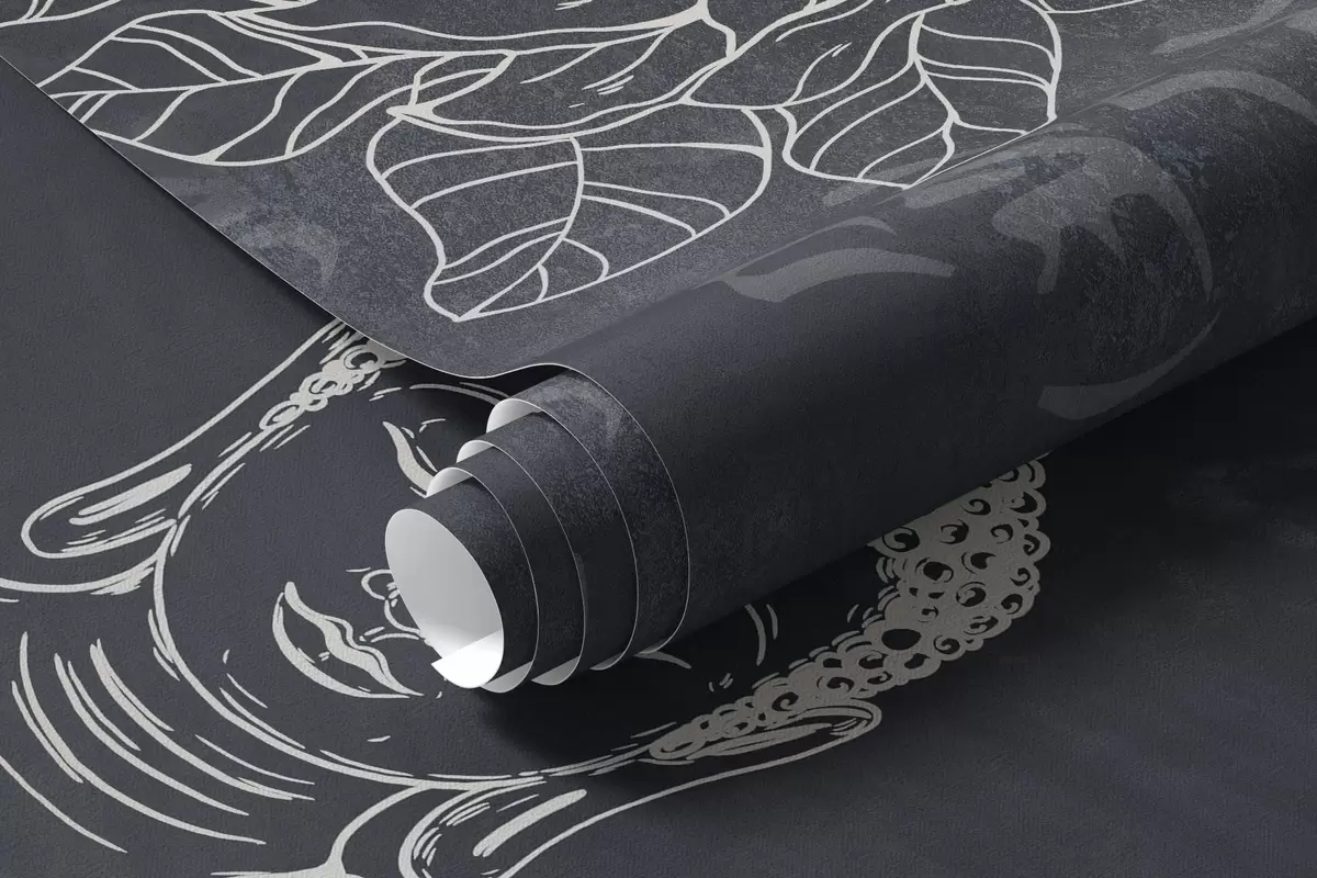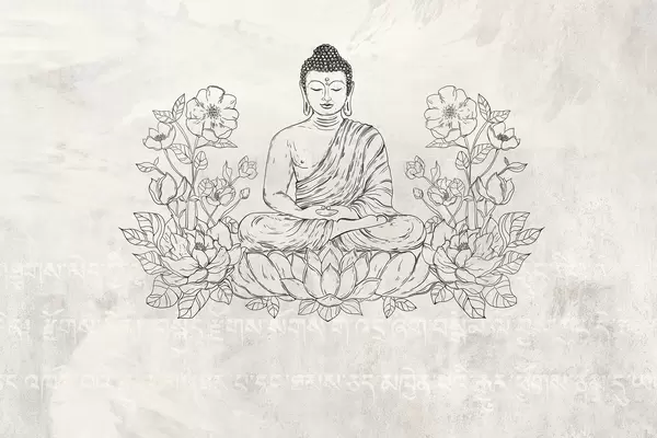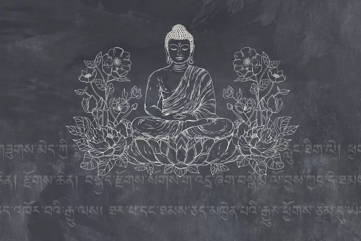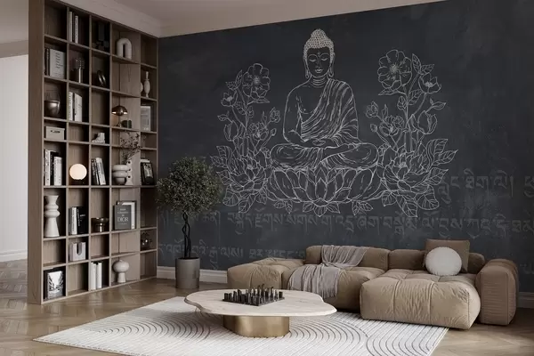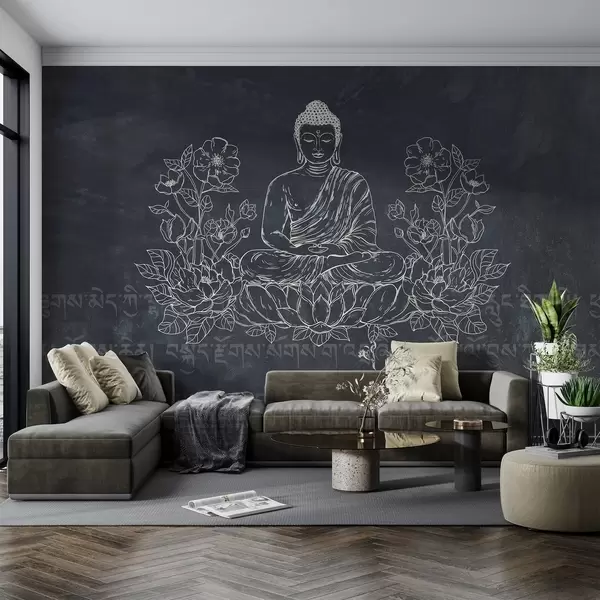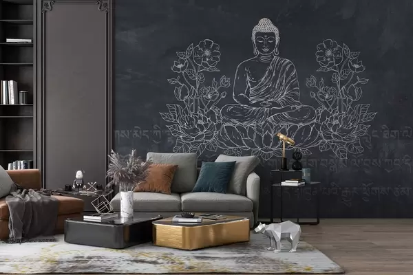 Фототапет Медитиращ Буда с лотосови цветя, изкуство на линията, ориенталски, тъмен фон Nr w04008