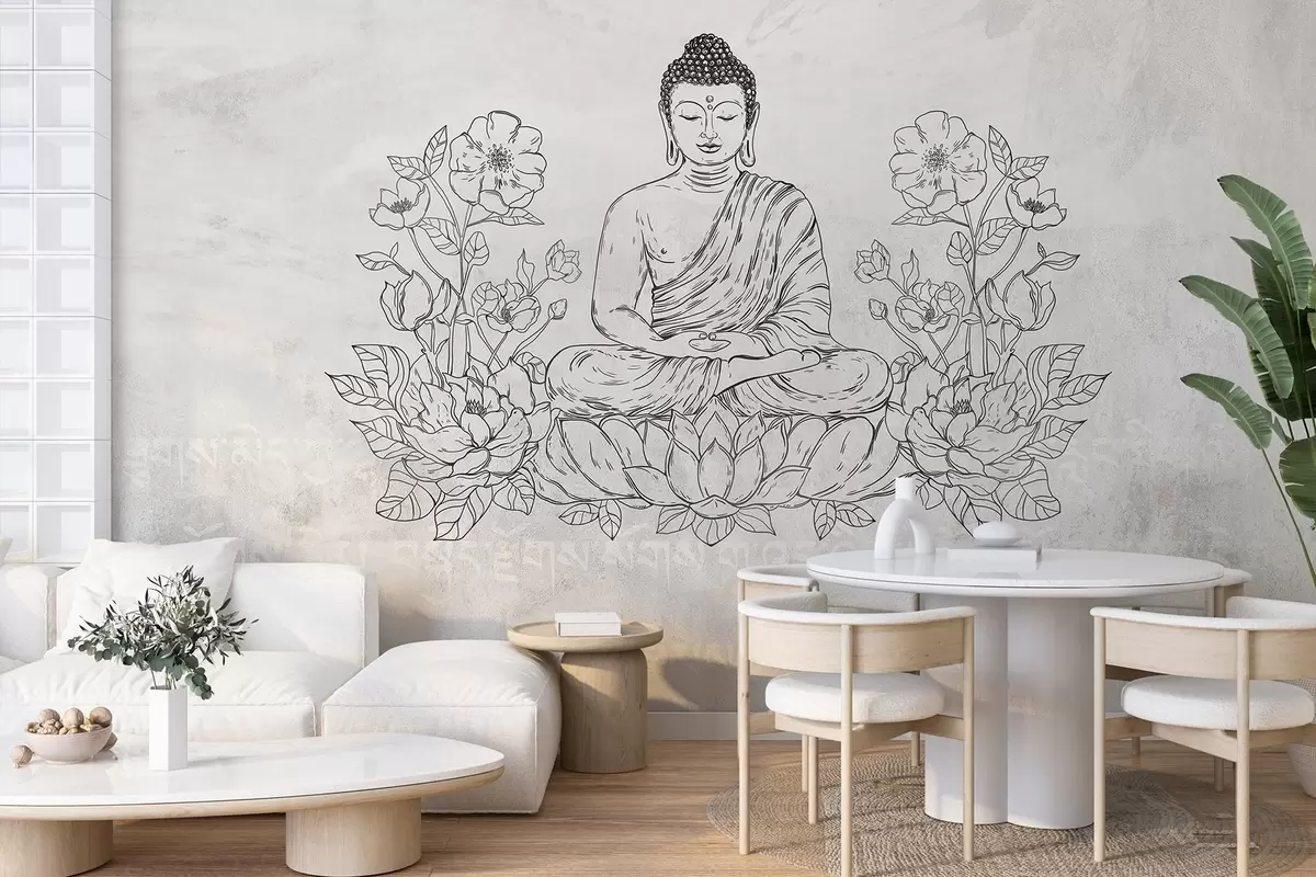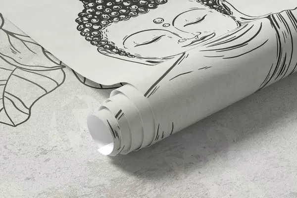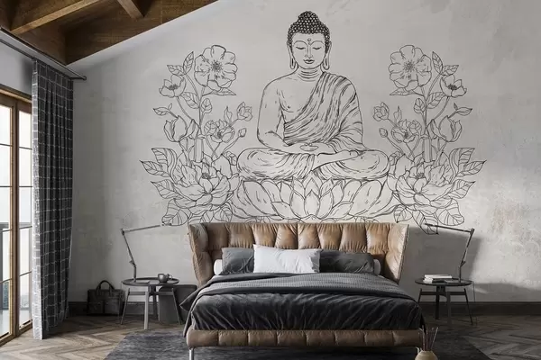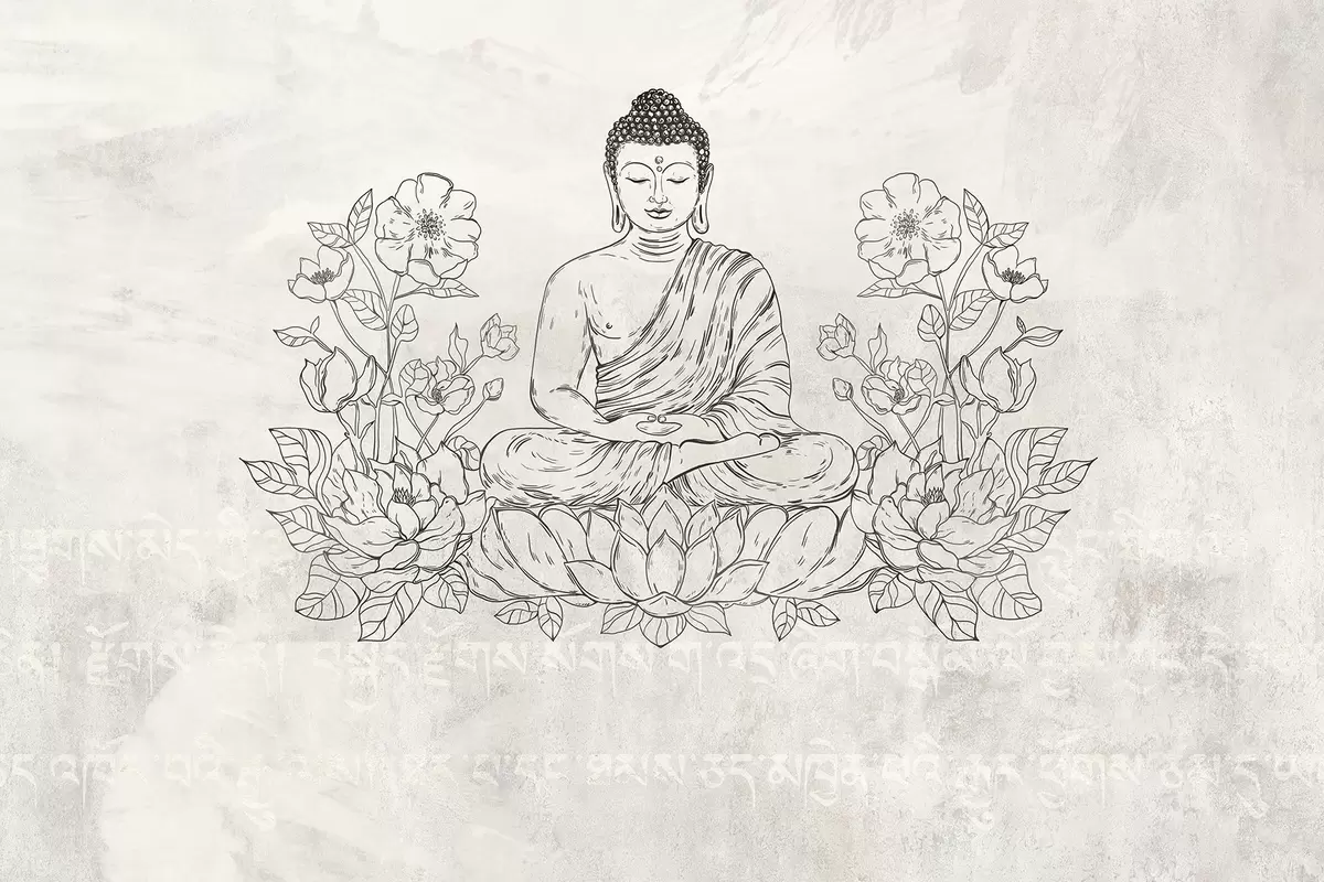 Фототапет Медитиращ Буда с лотосови цветя, изкуство на линията, ориенталски, бежов фон Nr w04008v1