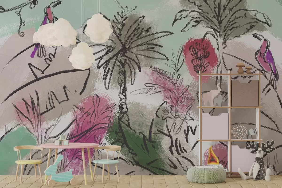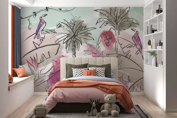 Фототапет Тропически принт с розови цветя и екзотични папагали Nr w04019v1