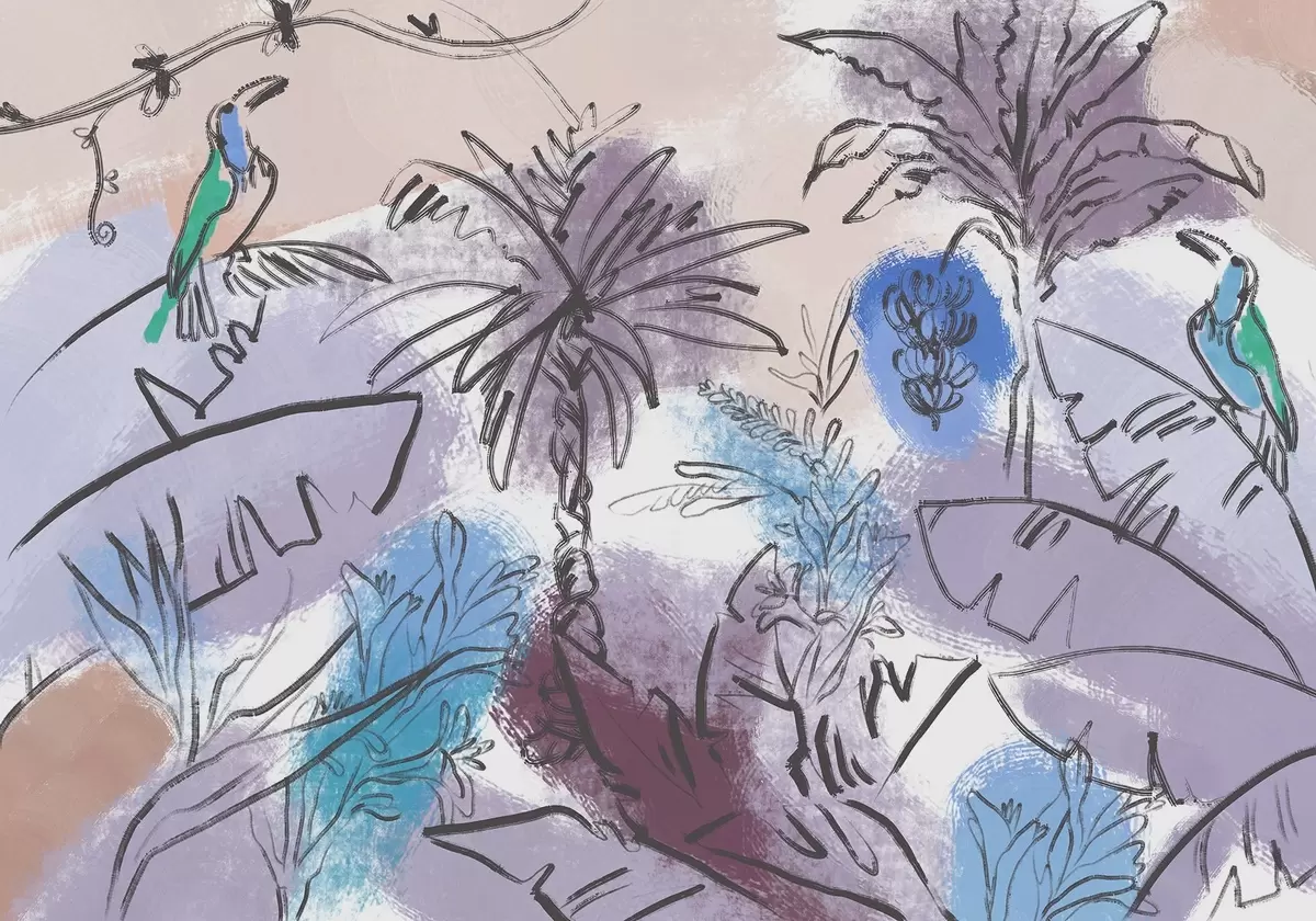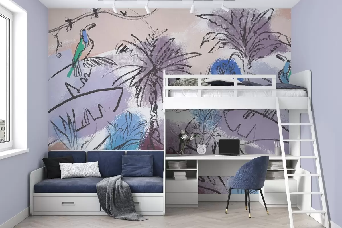 Фототапет Тропически принт със сини цветя, живописни папагали Nr w04019v2