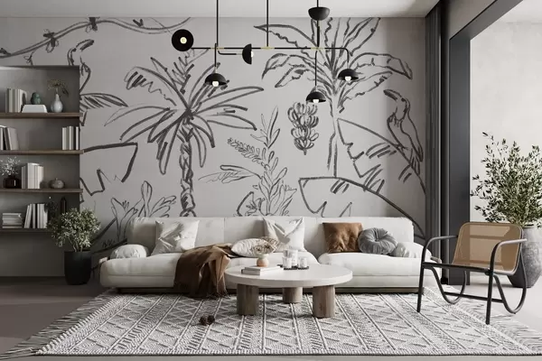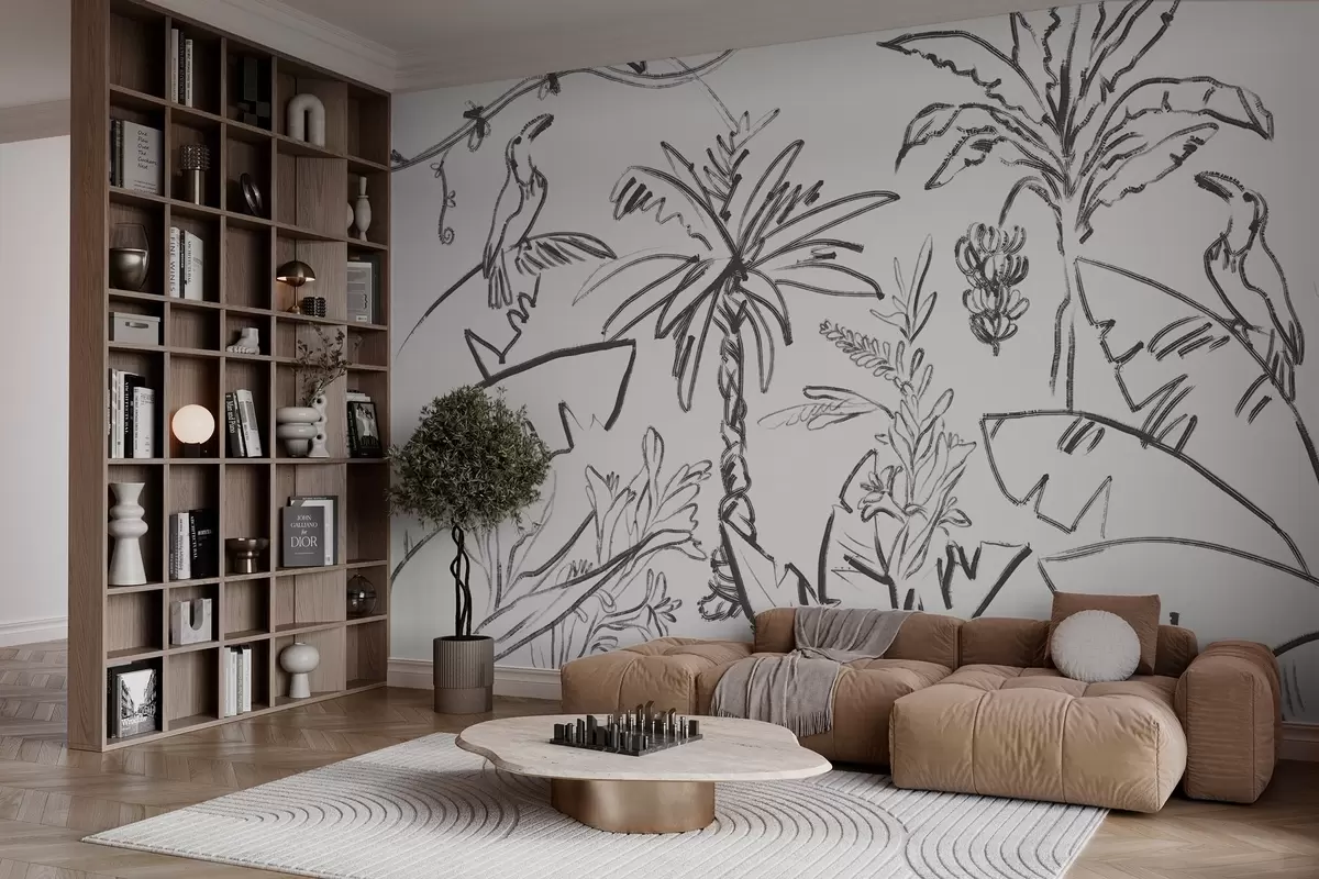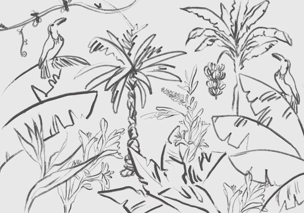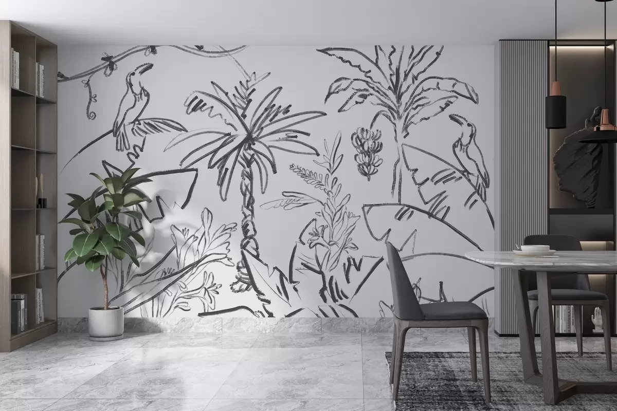 Фототапет Тропическа линейна рисунка, банани, палми, контурна графика Nr w04020