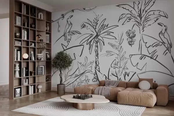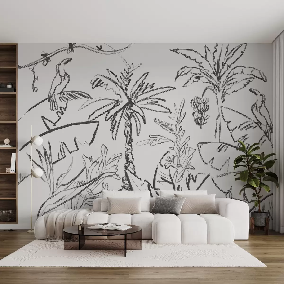 Фототапет Тропическа линейна рисунка, банани, палми, контурна графика Nr w04020