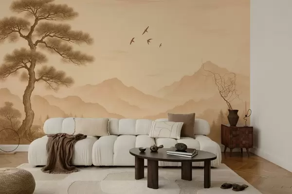 Фототапет панорама на хълмове с голямо дърво в стил сепия Nr w04033