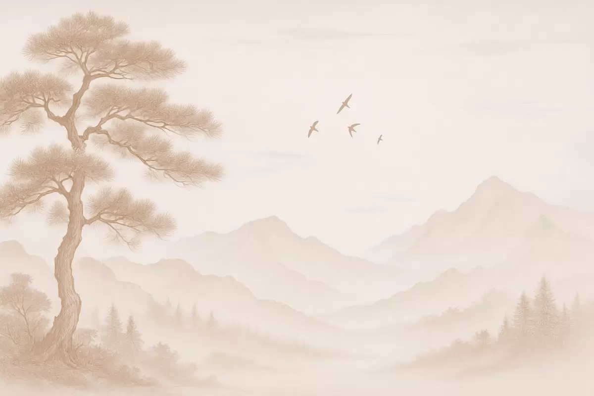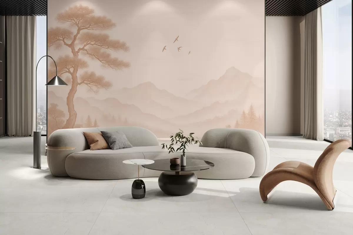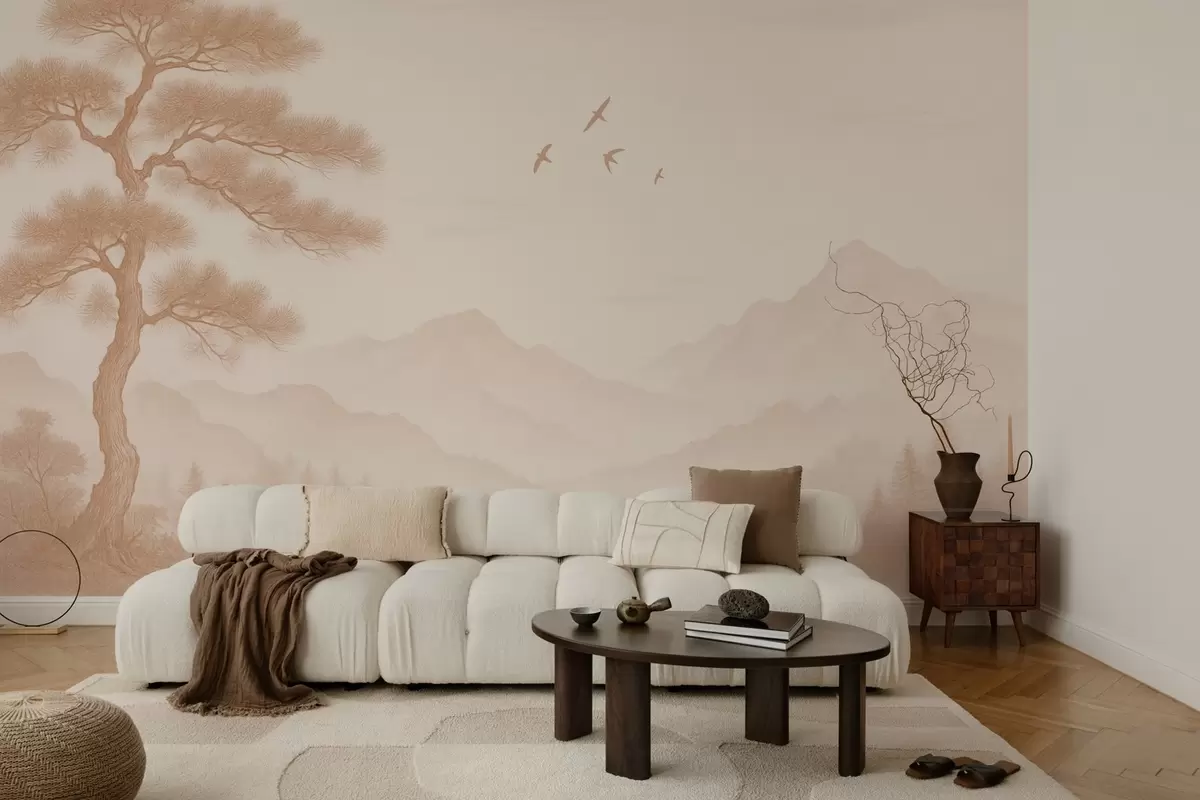 Фототапет панорама на хълмове с голямо дърво в нюанси на мока Nr w04033v1