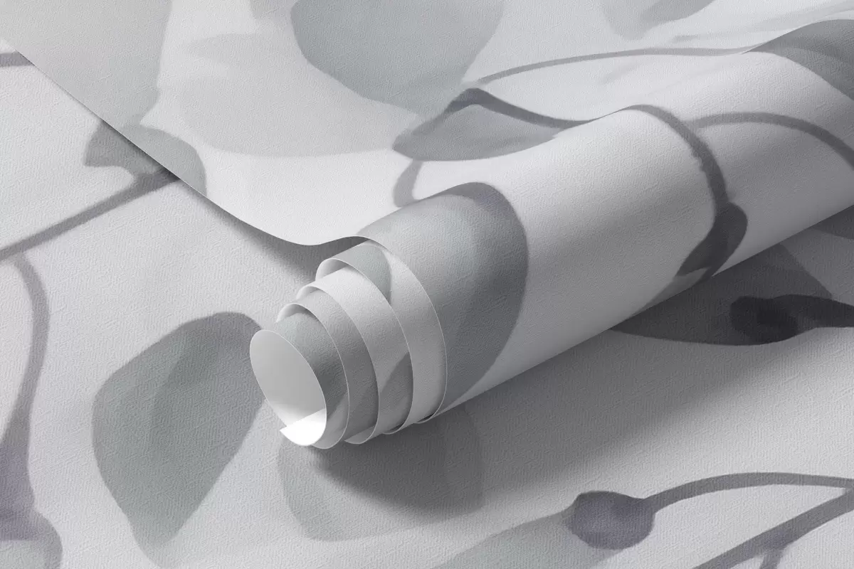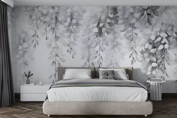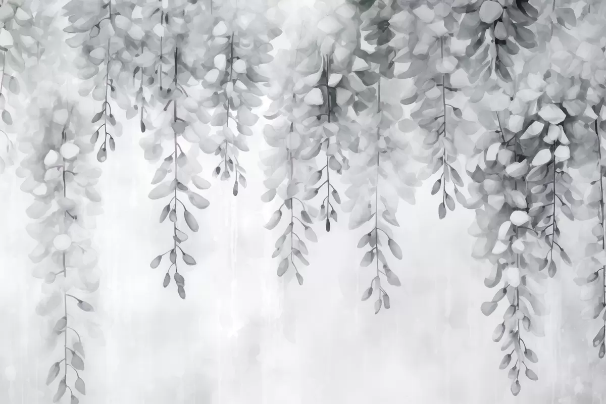 Фототапет Монохромен акварел с каскадна глициния в хладни сребристи и бели тонове, напомнящ за спокойствие и зимна мекота Nr w04034v1