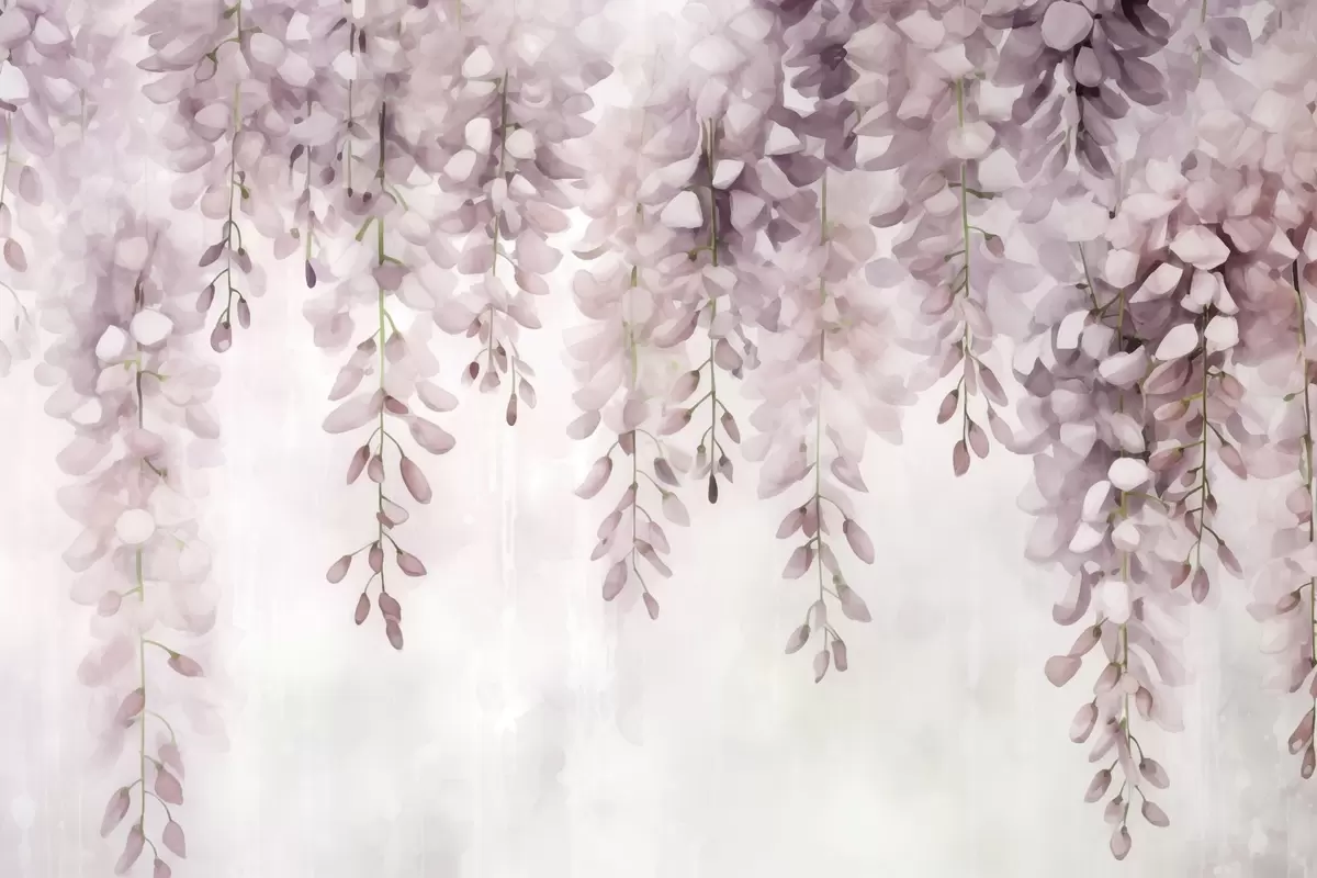 Фототапет Мека акварелна сцена в кремаво-розови тонове, с каскадни гроздове глициния, образуващи мечтателна флорална завеса Nr w04034v2
