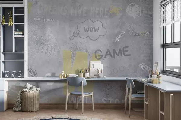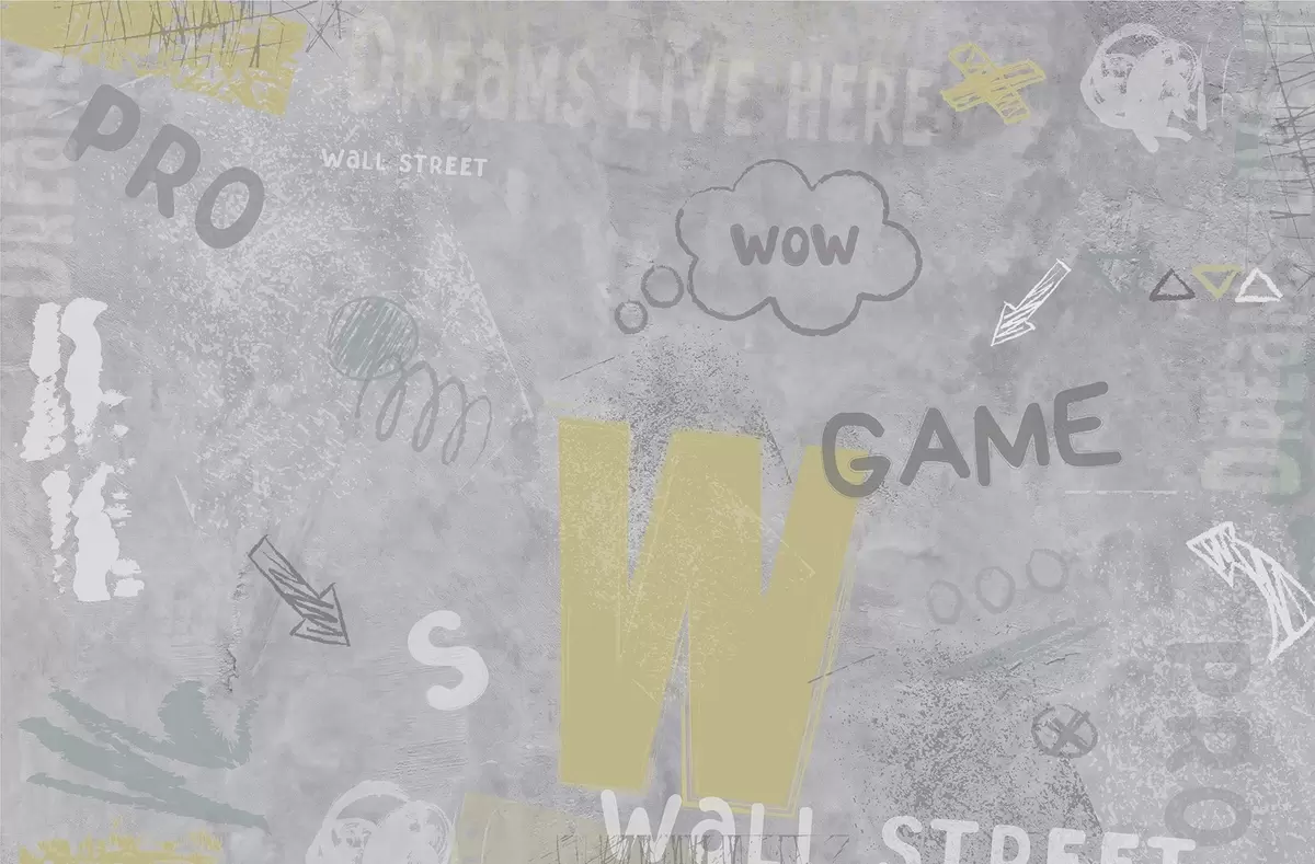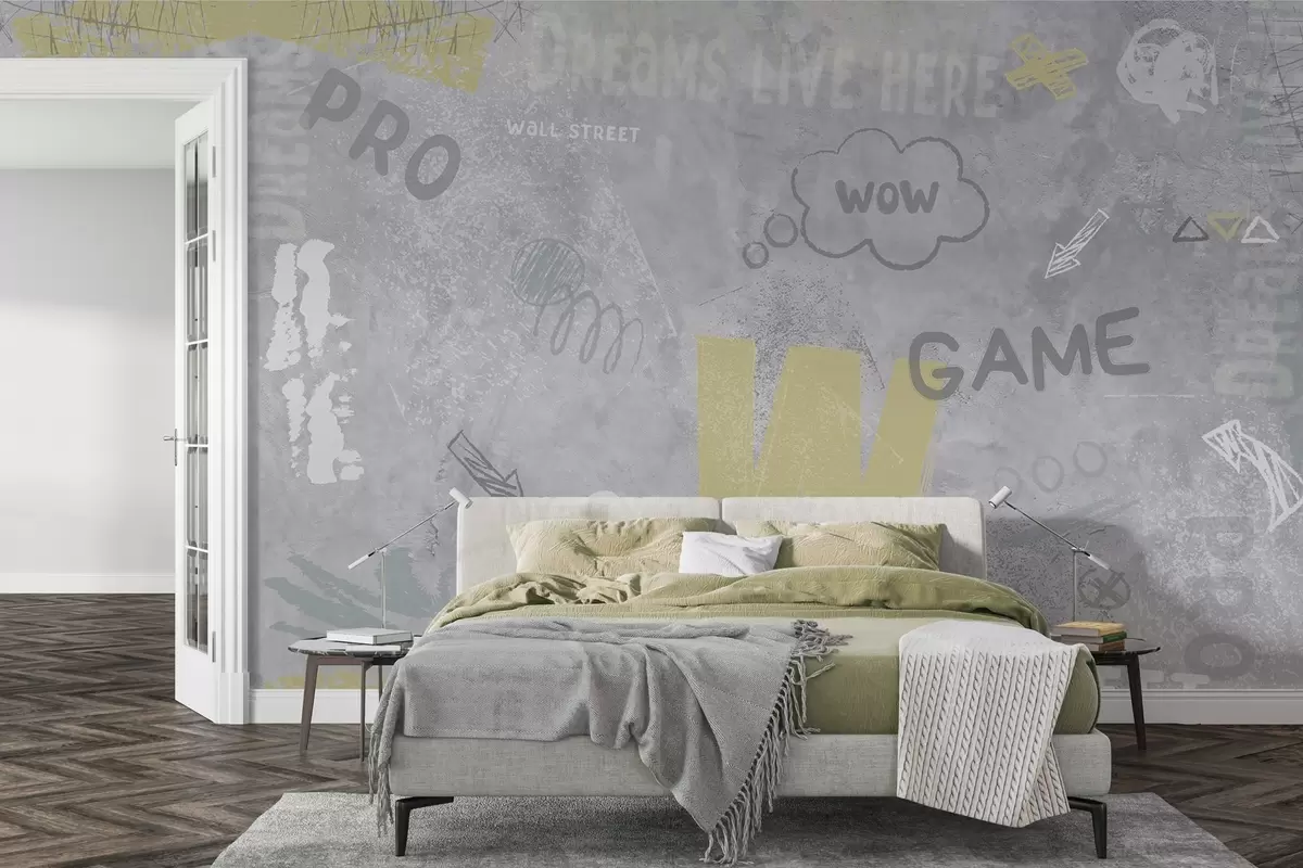 Фототапет Дизайн в стил стрийт арт с надписи в жълт цвят на фона на бетонна стена Nr w04056
