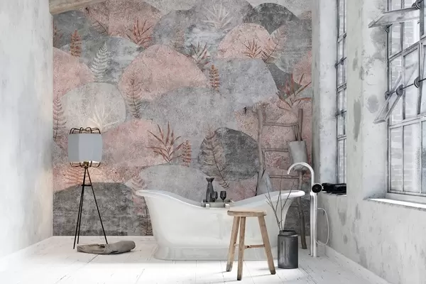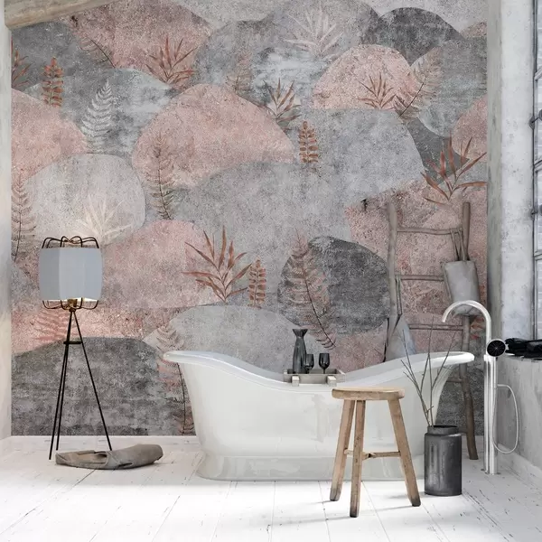 Фототапет Камъни с растения, папрат, скандинавски, рустикален стил, сиви и розови цветове Nr w04064v1