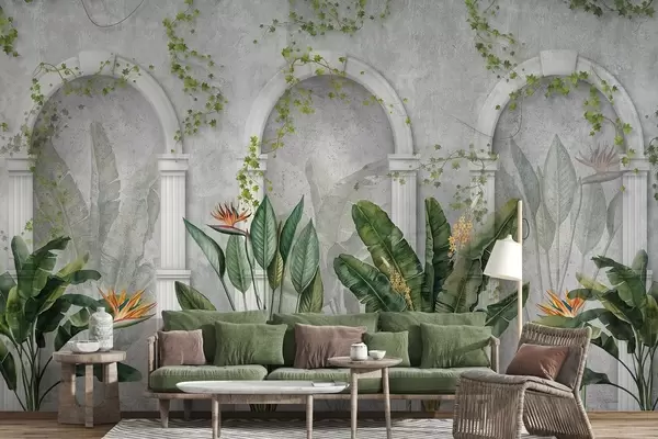 Фототапет Бетонна стена с арки и тропически растения, флорални, естествени цветове Nr w04065