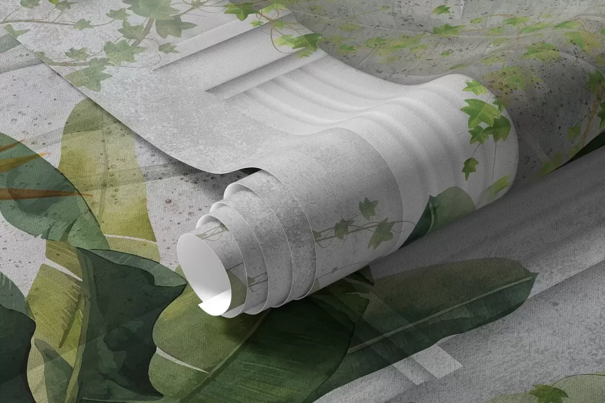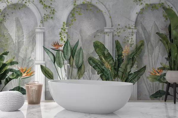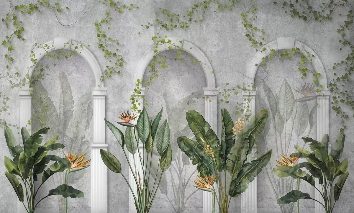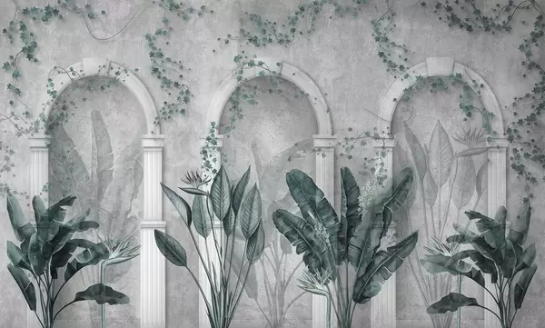 Фототапет Бетонна стена с арки и тропически растения, флорални, естествени цветове Nr w04065