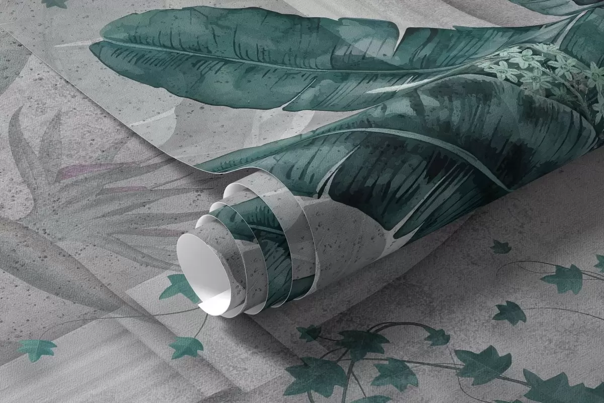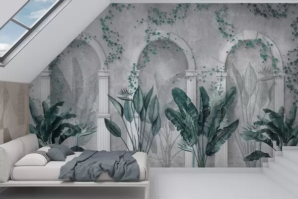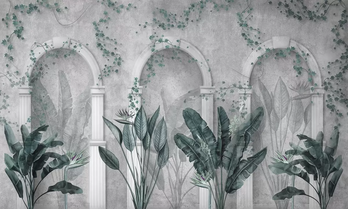 Фототапет Бетонна стена с арки и тропически растения, флорални, сини цветове Nr w04065v2