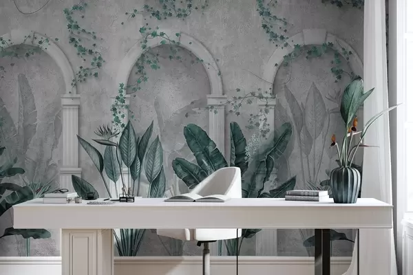 Фототапет Бетонна стена с арки и тропически растения, флорални, сини цветове Nr w04065v2