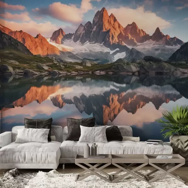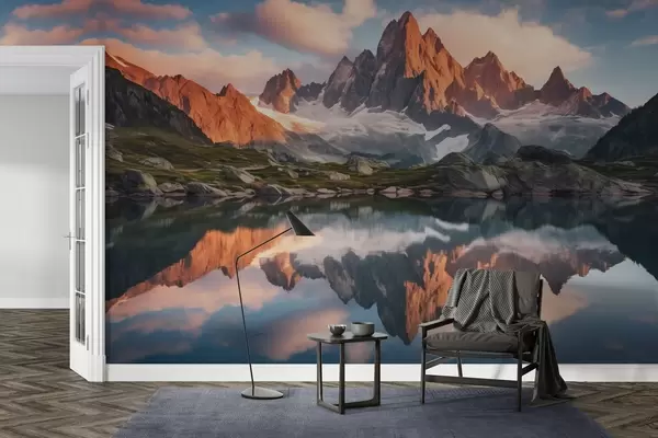 Фототапет Планини на разсъмване, отражение във вода, реалистичен пейзаж Nr w04150