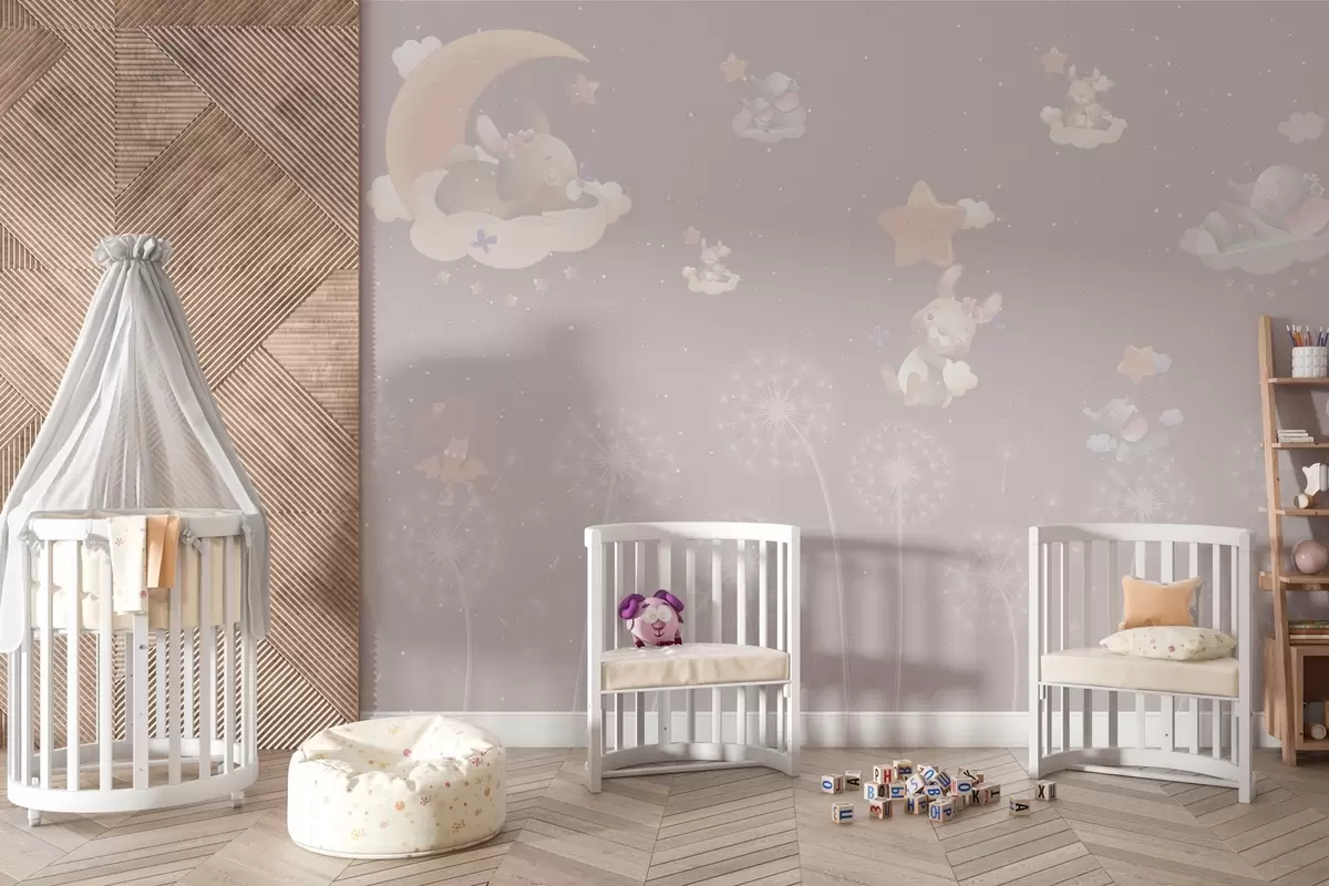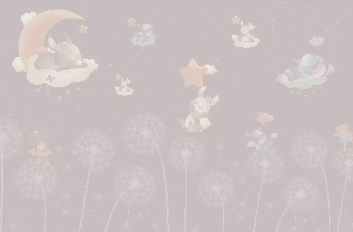 Фототапет Приказна нощ със заек и глухарчета на розов фон Nr w04195v2