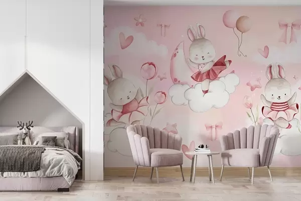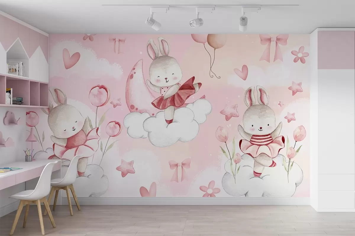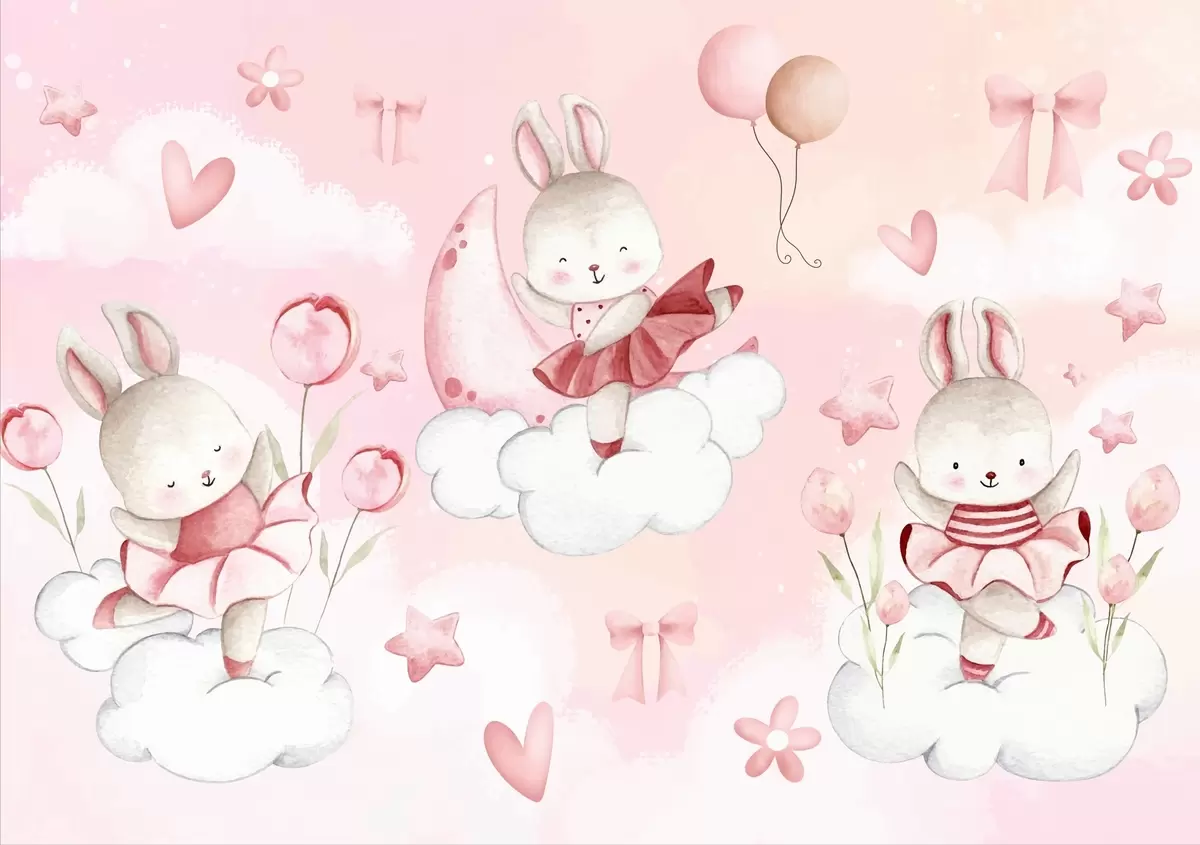 Фототапет Зайци в розови балетни рокли върху облаци Nr w04333
