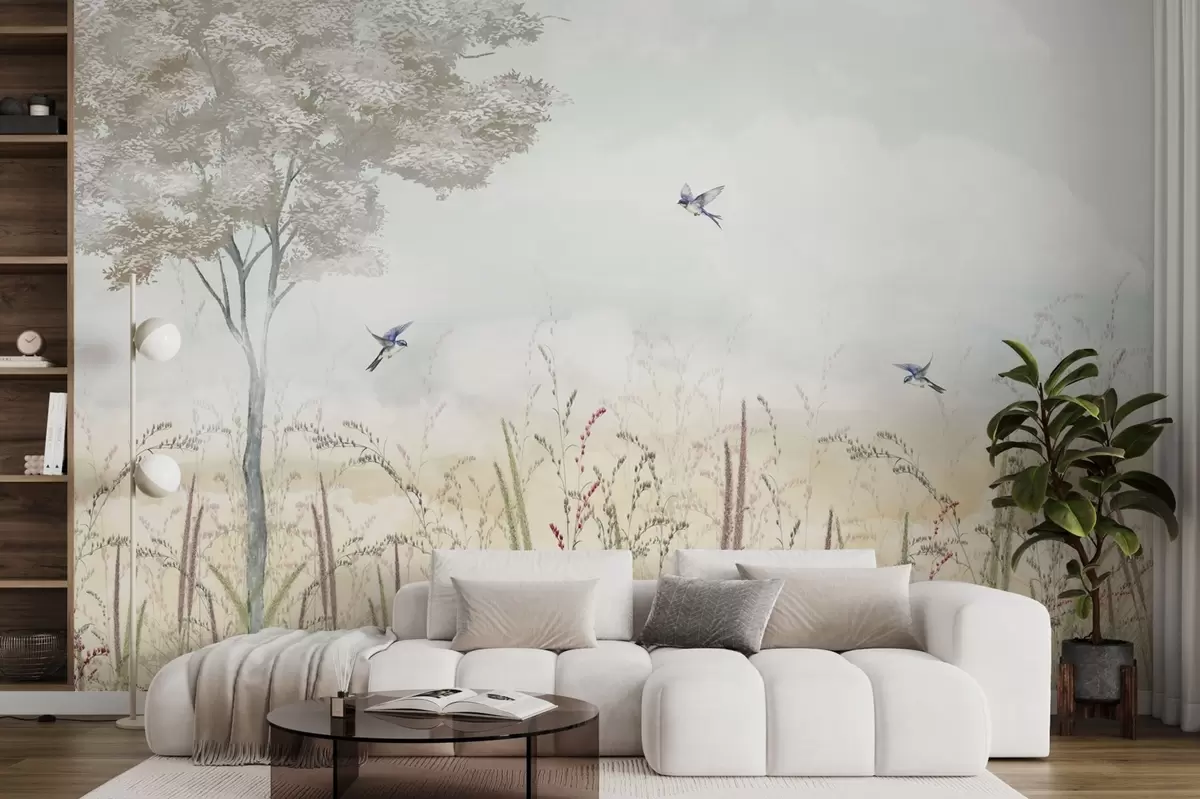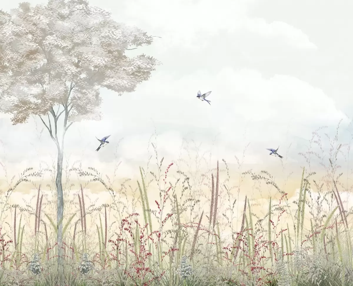 Фототапет Пейзаж с дърво, птици и ливадни треви Nr w04350