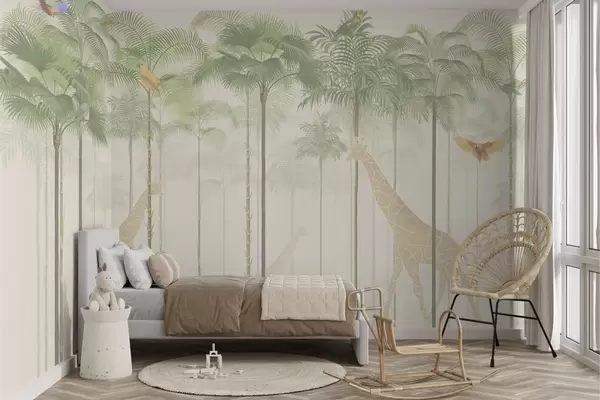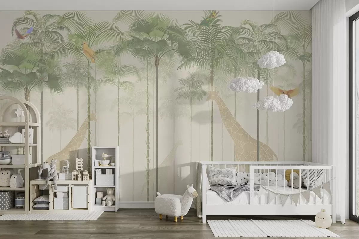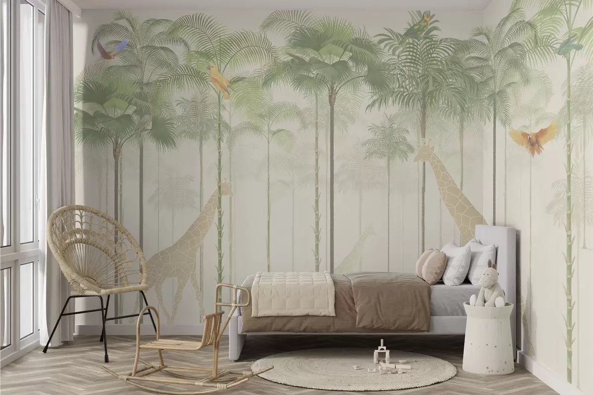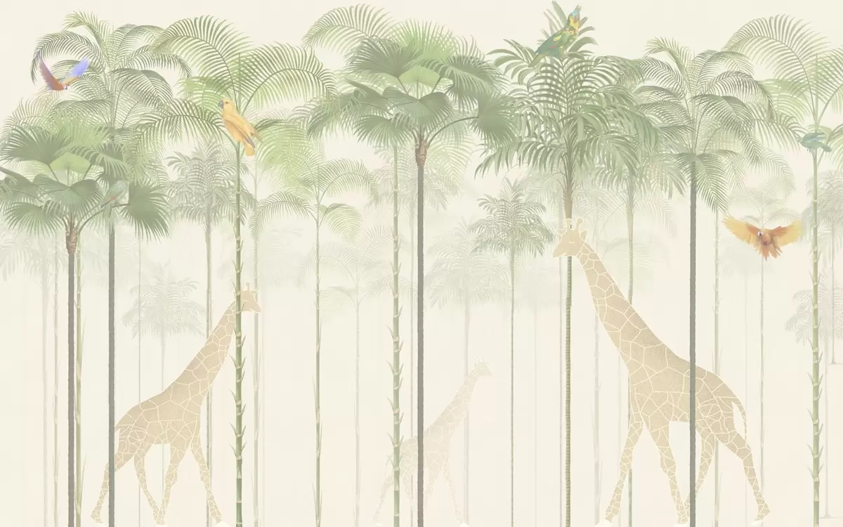 Фототапет Жирафи и тропически птици сред високи палми Nr w04400