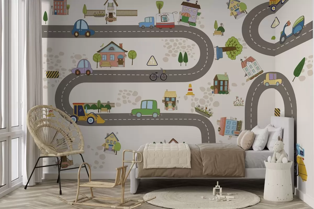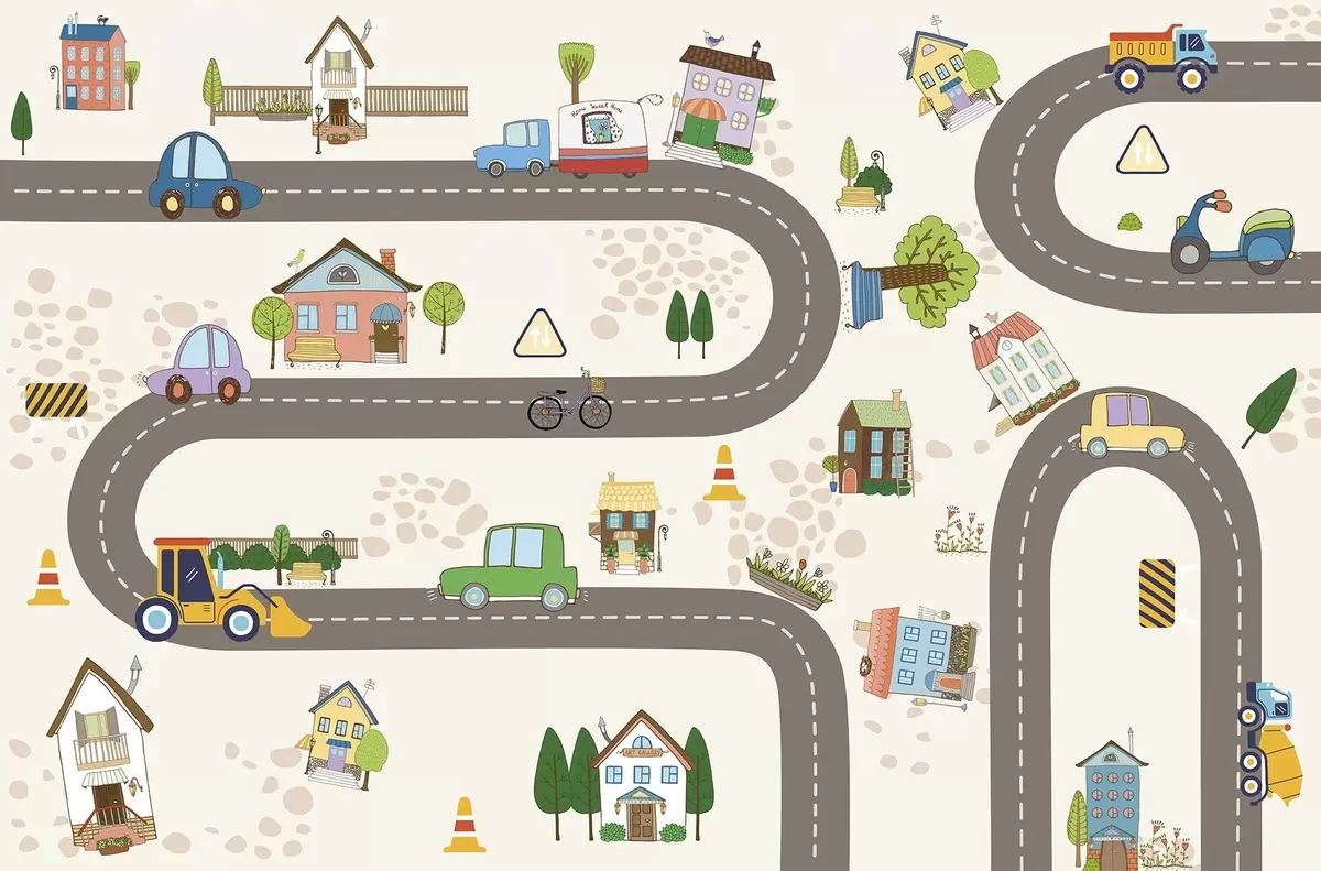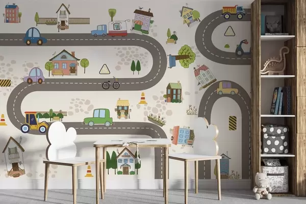 Фототапет Детски път с коли и цветни къщички Nr w04404