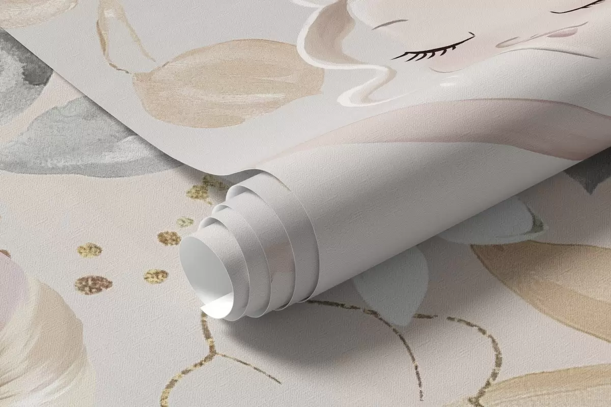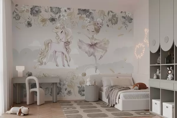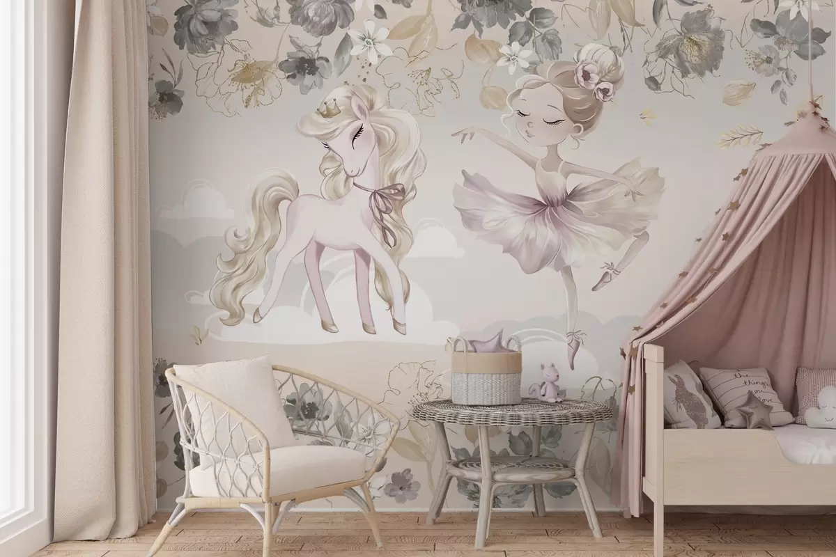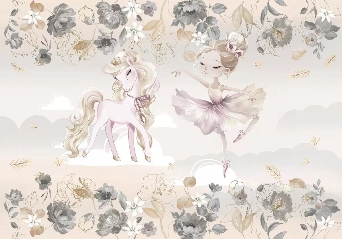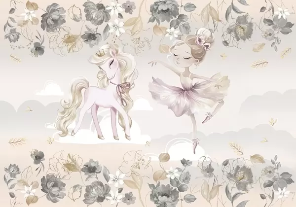 Фототапет Снежнобяло пони и балерина сред цветя и облаци Nr w04419