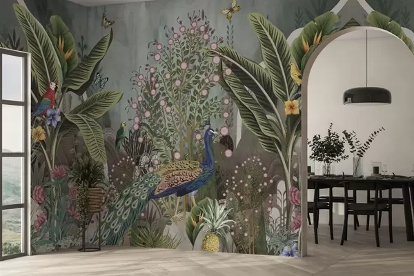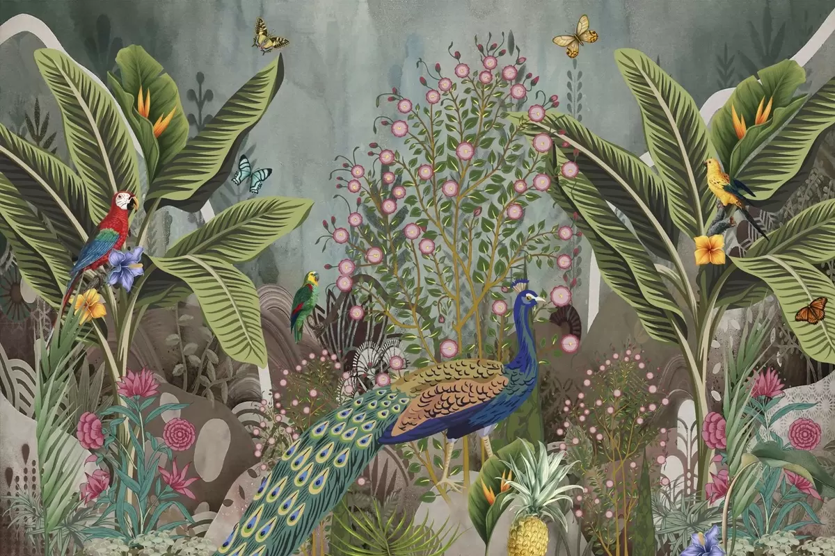 Фототапет Ярки тропически птици и паун сред екзотични растения Nr w04457