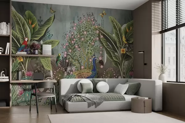Фототапет Ярки тропически птици и паун сред екзотични растения Nr w04457