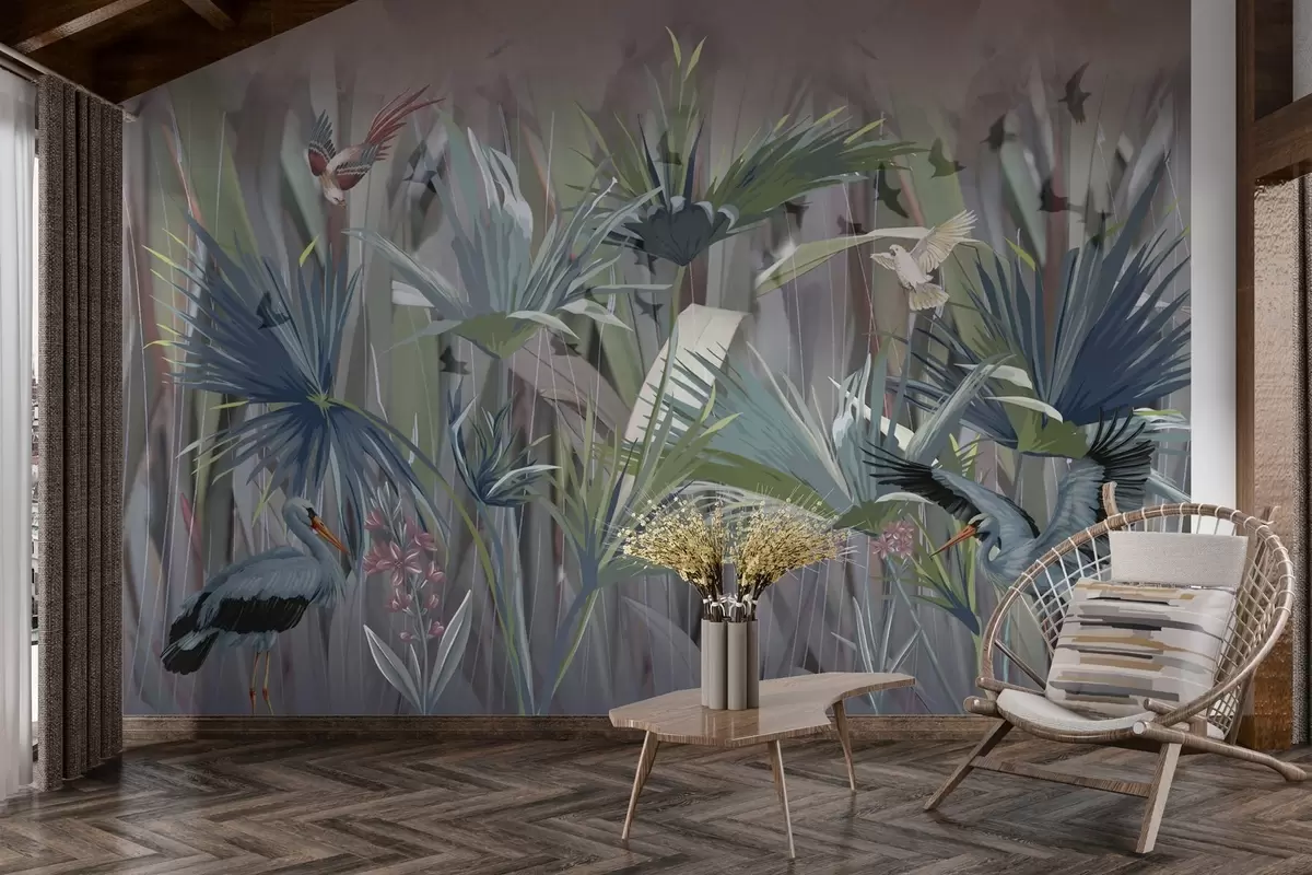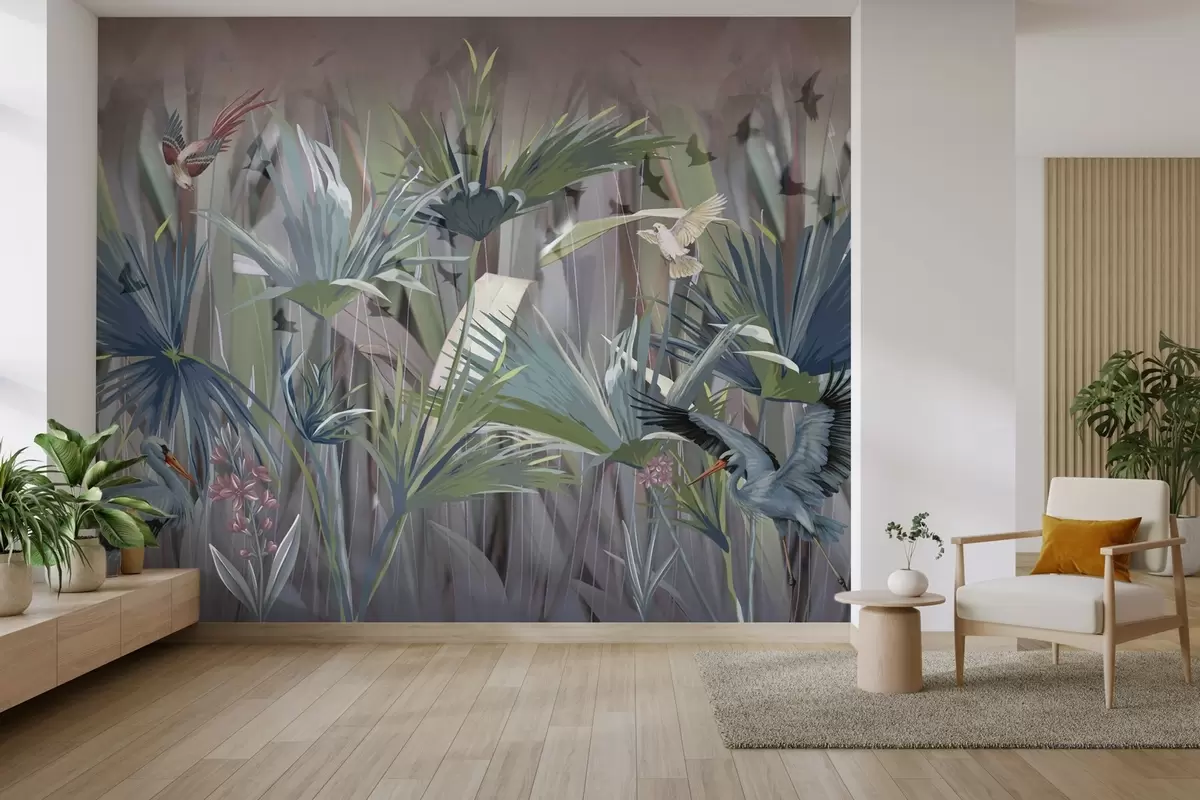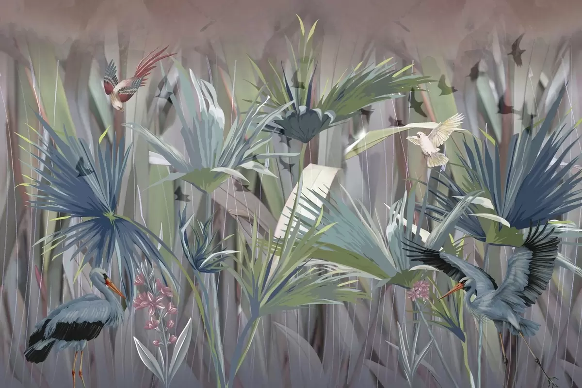 Фототапет Екзотични птици сред палмови листа и цветя Nr w04458