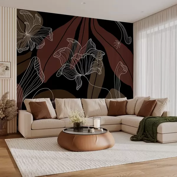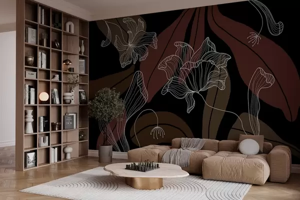 Фототапет абстрактни листа и цветя в прахообразни и бежови тонове на тъмен фон w04499v3