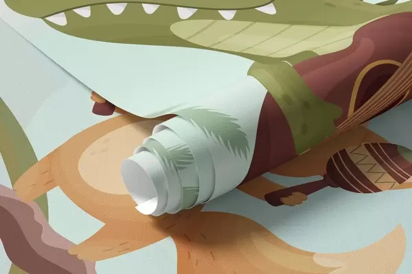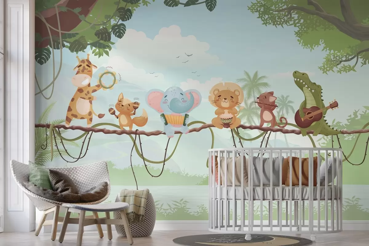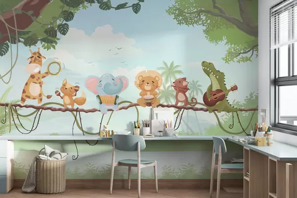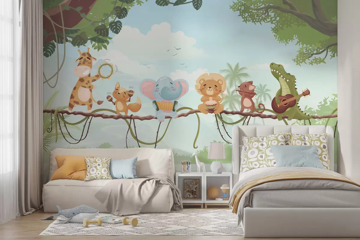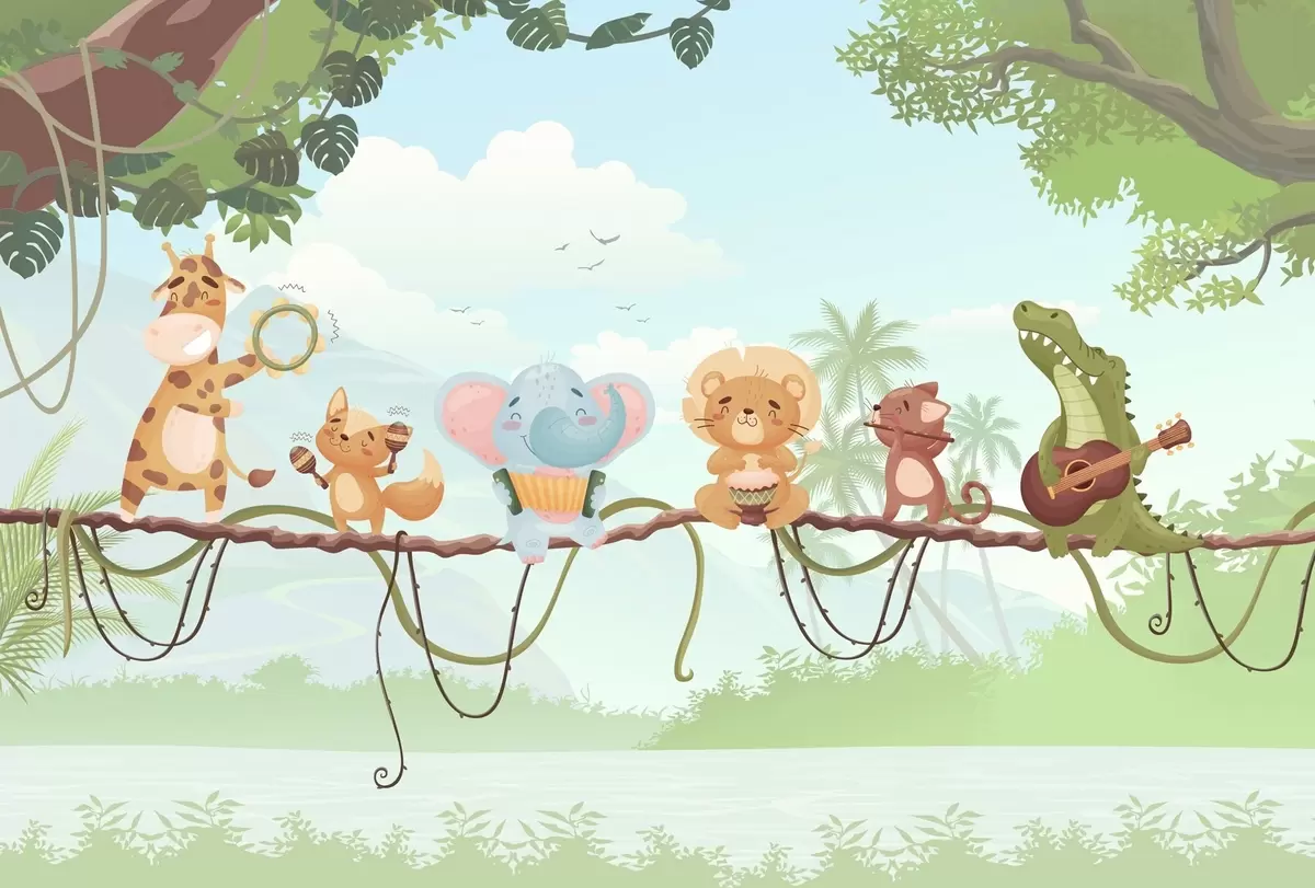 Фототапет Животни с музикални инструменти на фона на тропически пейзаж Nr w04505