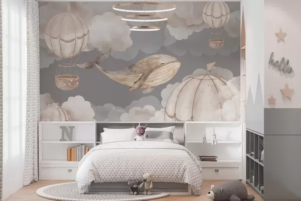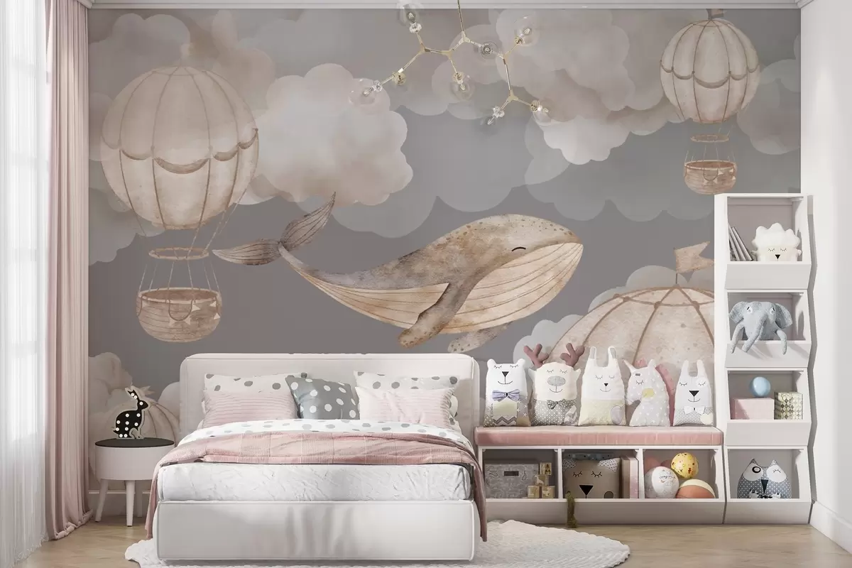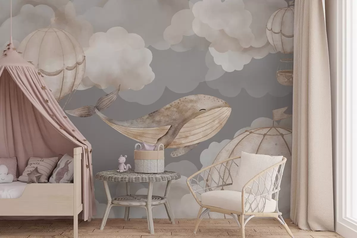Фототапет Кит и горещи въздушни балони сред меки облаци Nr w04522
