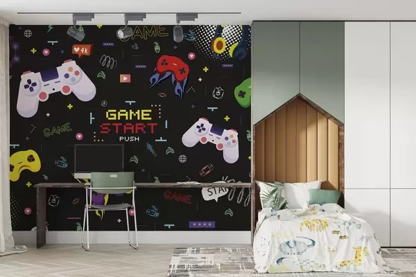 Фототапет Ярък геймърски мотив с конзоли и пикселизиран текст Nr w04581