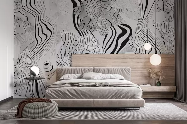 Фототапет абстрактни органични форми в 3D стил в бели и сиви тонове с черни ивици Nr w04627