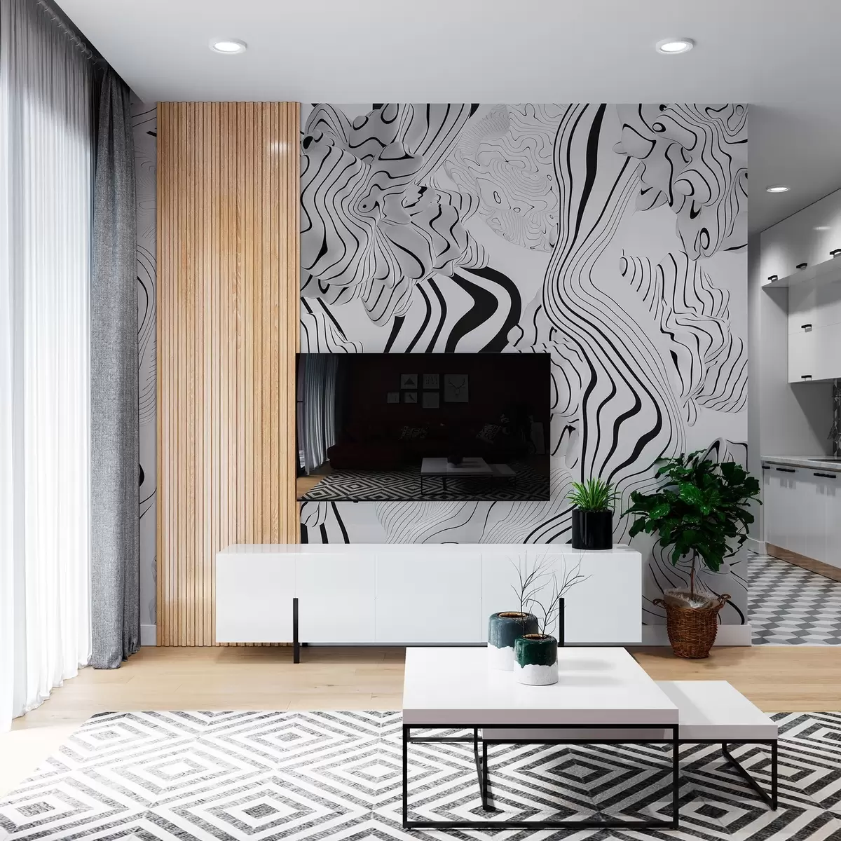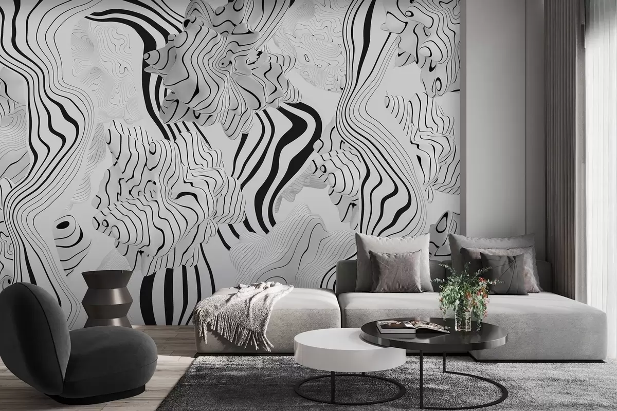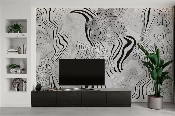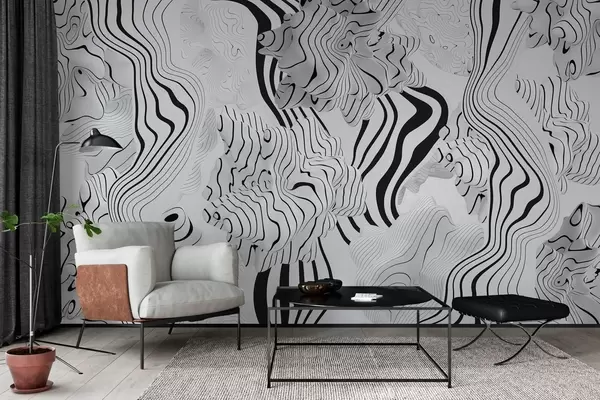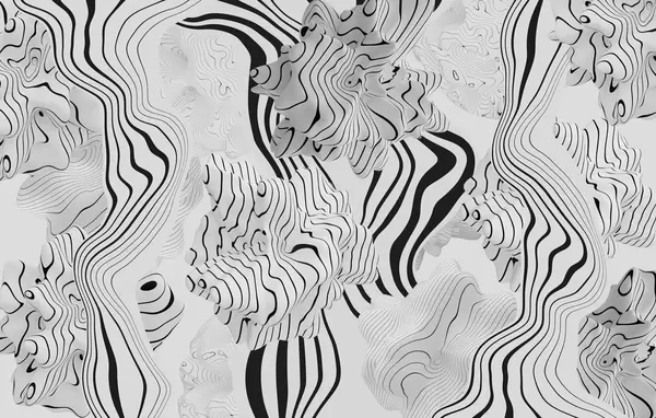 Фототапет абстрактни органични форми в 3D стил в бели и сиви тонове с черни ивици Nr w04627