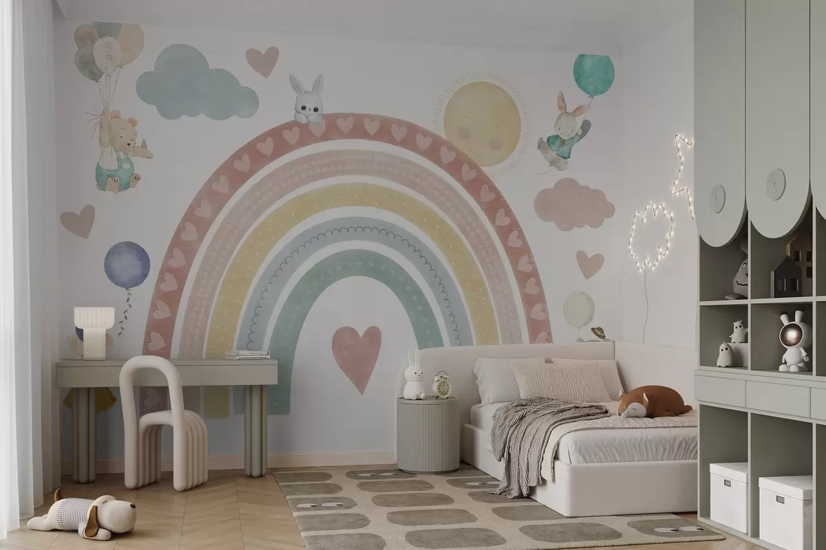 Фототапет Пастелна дъга със сърца, животни и балони Nr w04681