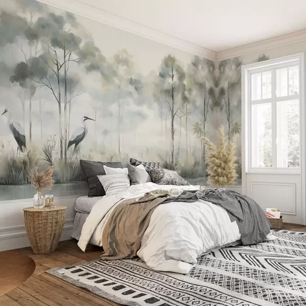 Фототапет Мъглива гора край водата с чапли, мека, хладна палитра Nr w04788