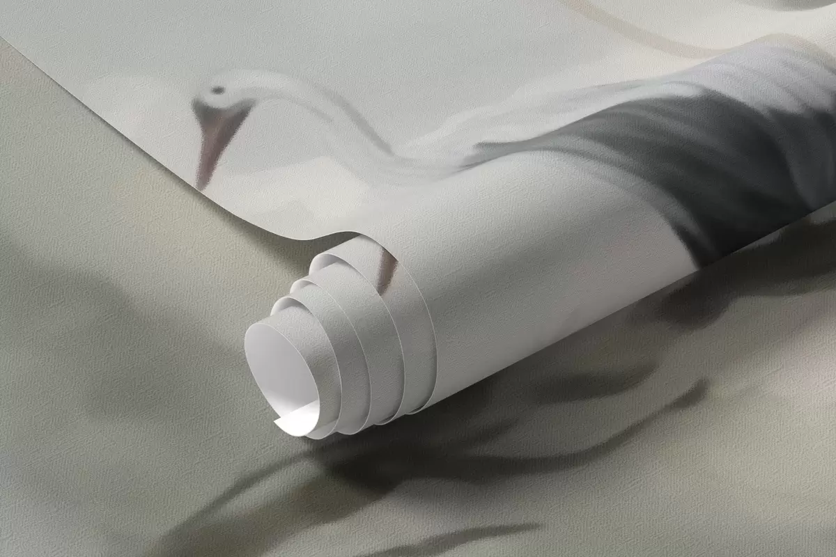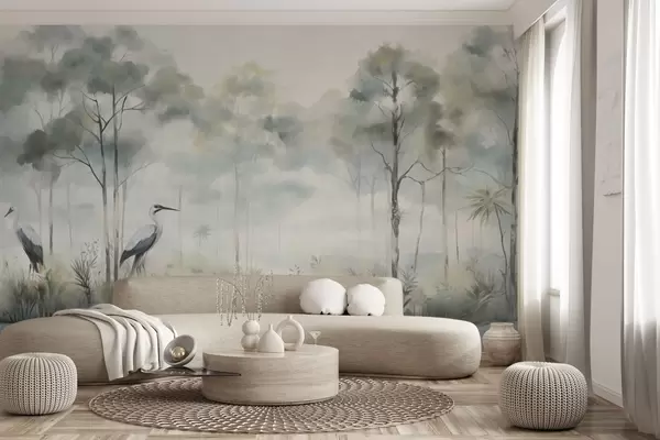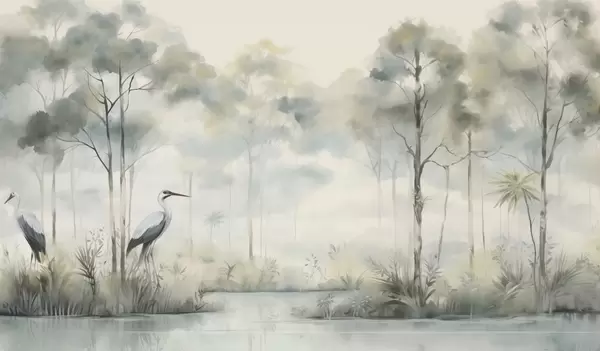 Фототапет Мъглива гора край водата с чапли, мека, хладна палитра Nr w04788