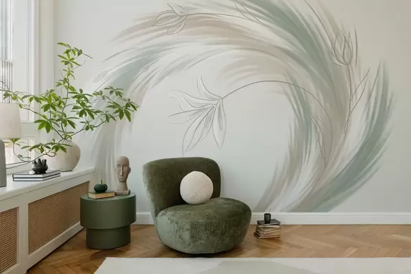 Фототапет зелени и бежови пера и цветя, ръчно рисувани Nr w04816