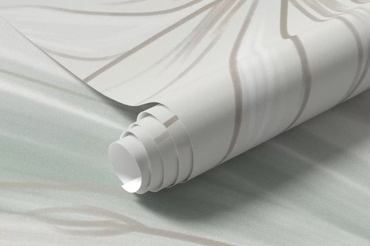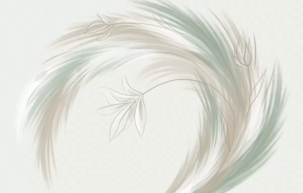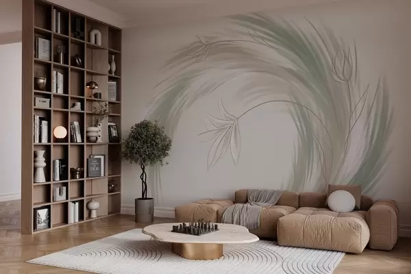 Фототапет зелени и бежови пера и цветя, ръчно рисувани Nr w04816