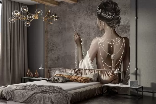 Фототапет Жена, видяна отзад, с перли, на фона със сив каменен мотив Nr w04854