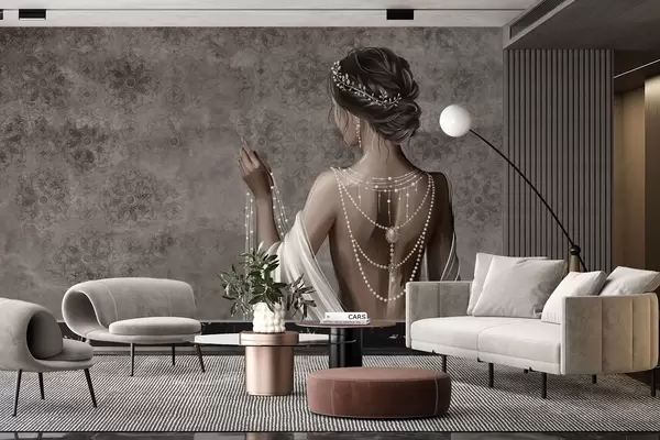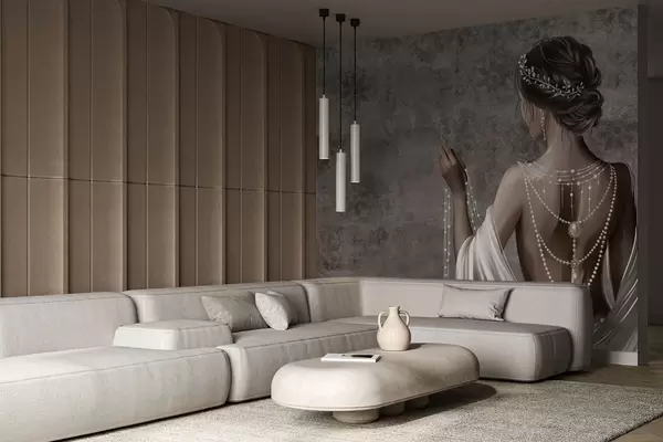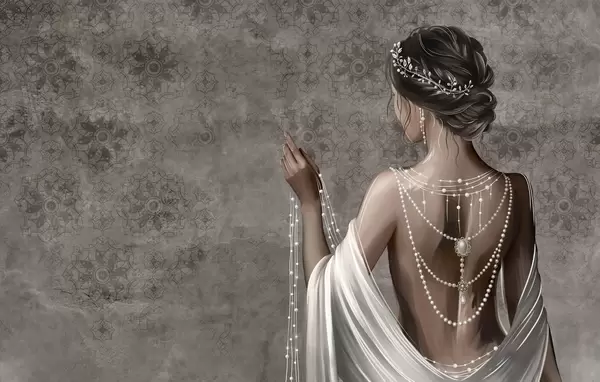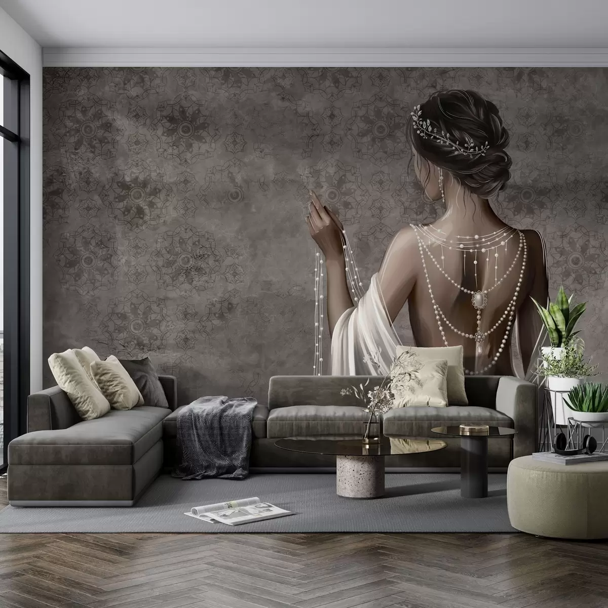 Фототапет Жена, видяна отзад, с перли, на фона със сив каменен мотив Nr w04854