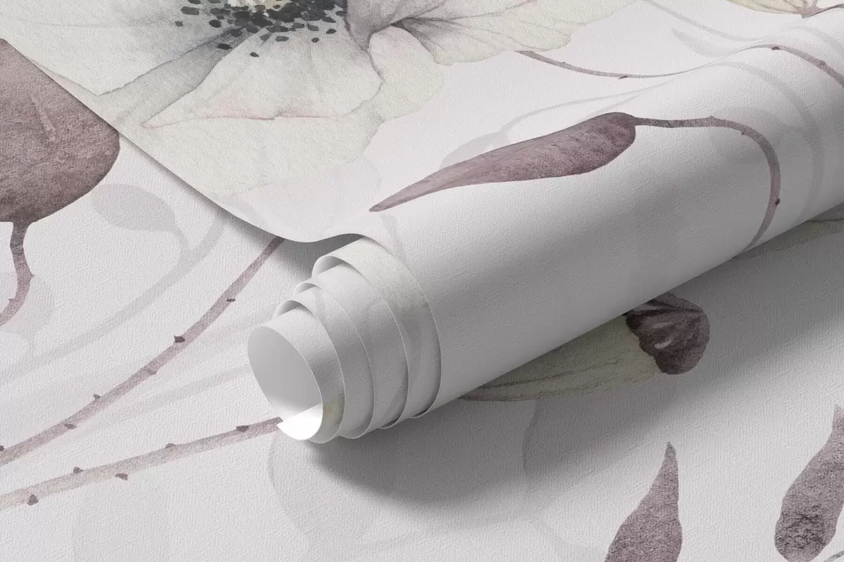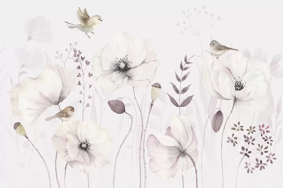 Фототапет Акварелни макове с малки птички в нежно лилаво Nr w04861