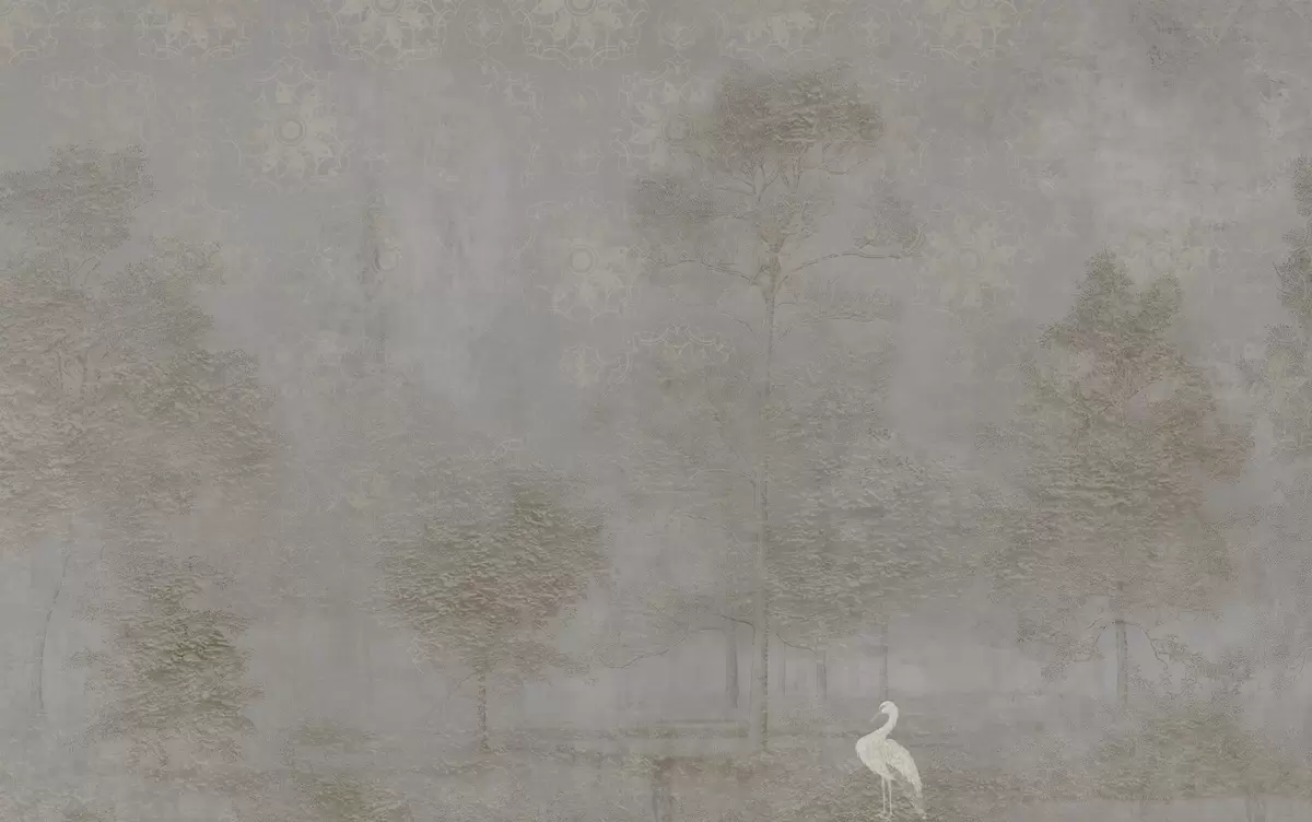 Фототапет Мъглива гора с чапла и декоративен мотив отгоре Nr w04953v1