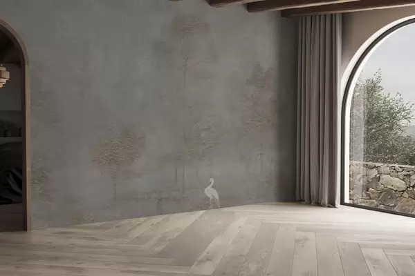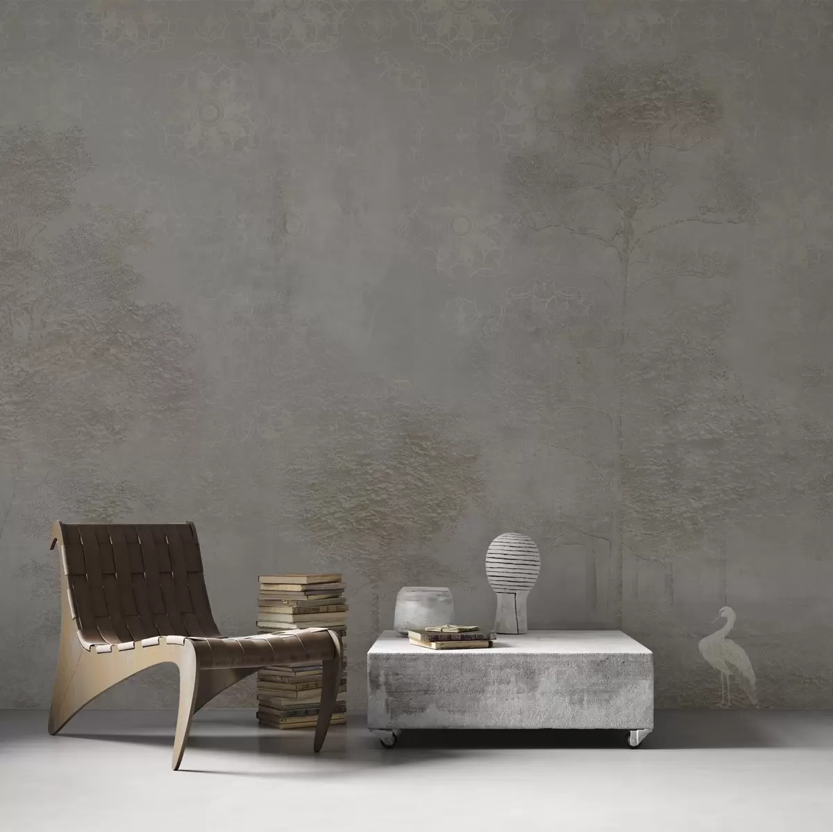Фототапет Мъглива гора с чапла и декоративен мотив отгоре Nr w04953v1