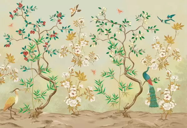 Фототапет Декоративна сцена с дървета, цветя и птици на тъмен фон Nr w05004