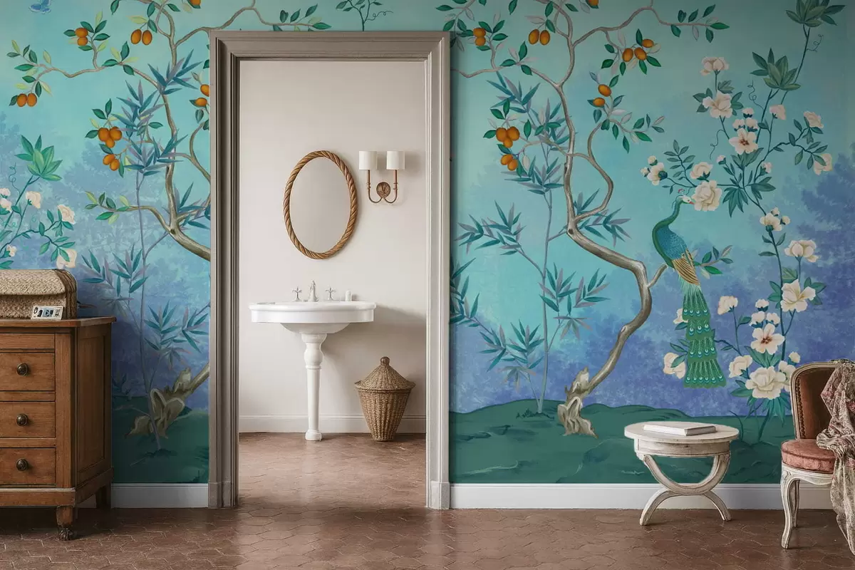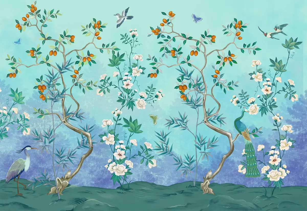 Фототапет Сцена с дървета, цветя и птици, син фон Nr w05004v2