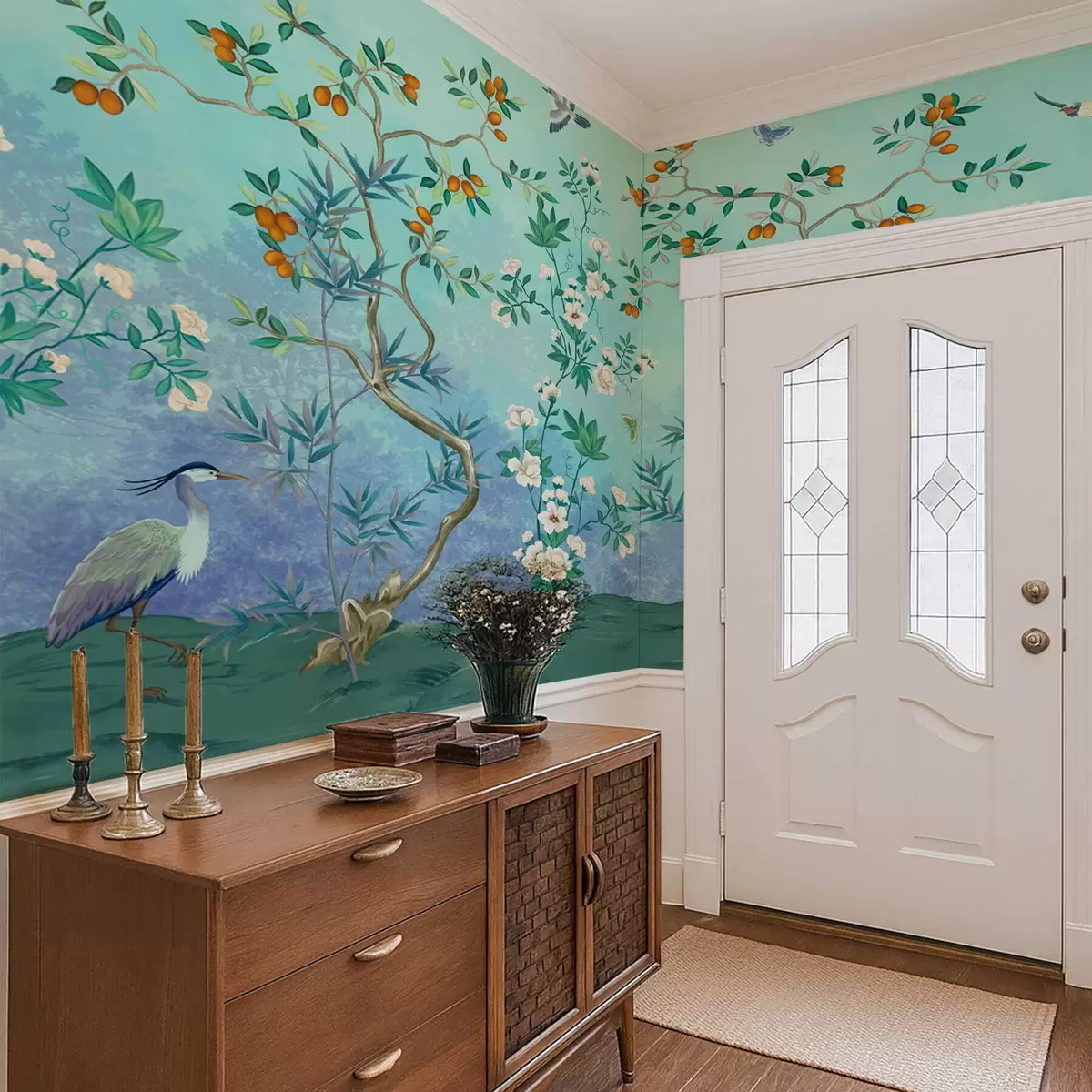 Фототапет Сцена с дървета, цветя и птици, син фон Nr w05004v2