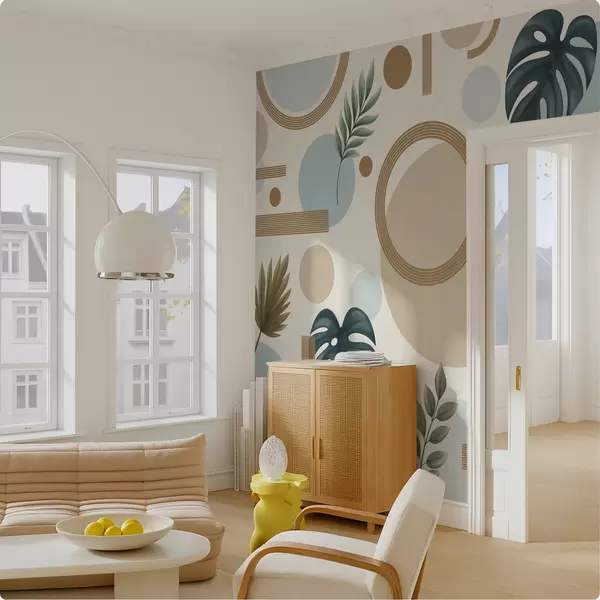 Фототапет Геометричен мотив с листа и кръгове в спокойни тонове Nr w05018