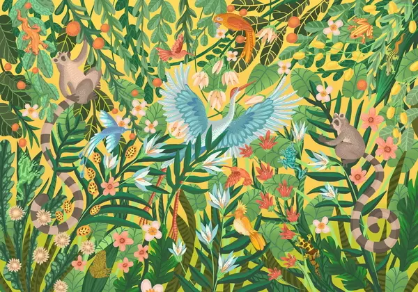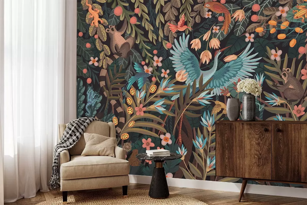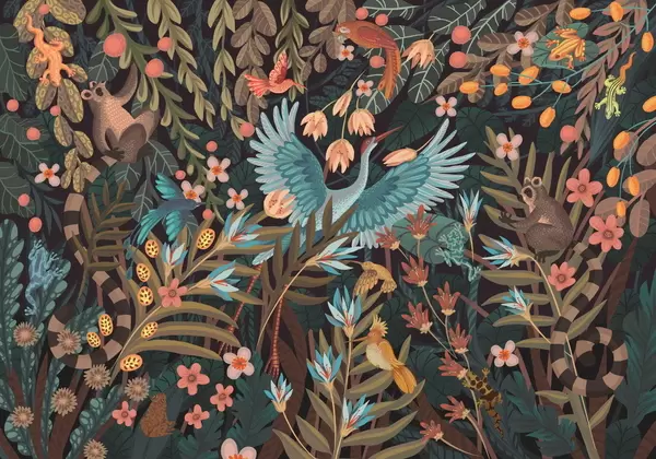 Фототапет Фантастична сцена с птици и животни сред растения Nr w05024