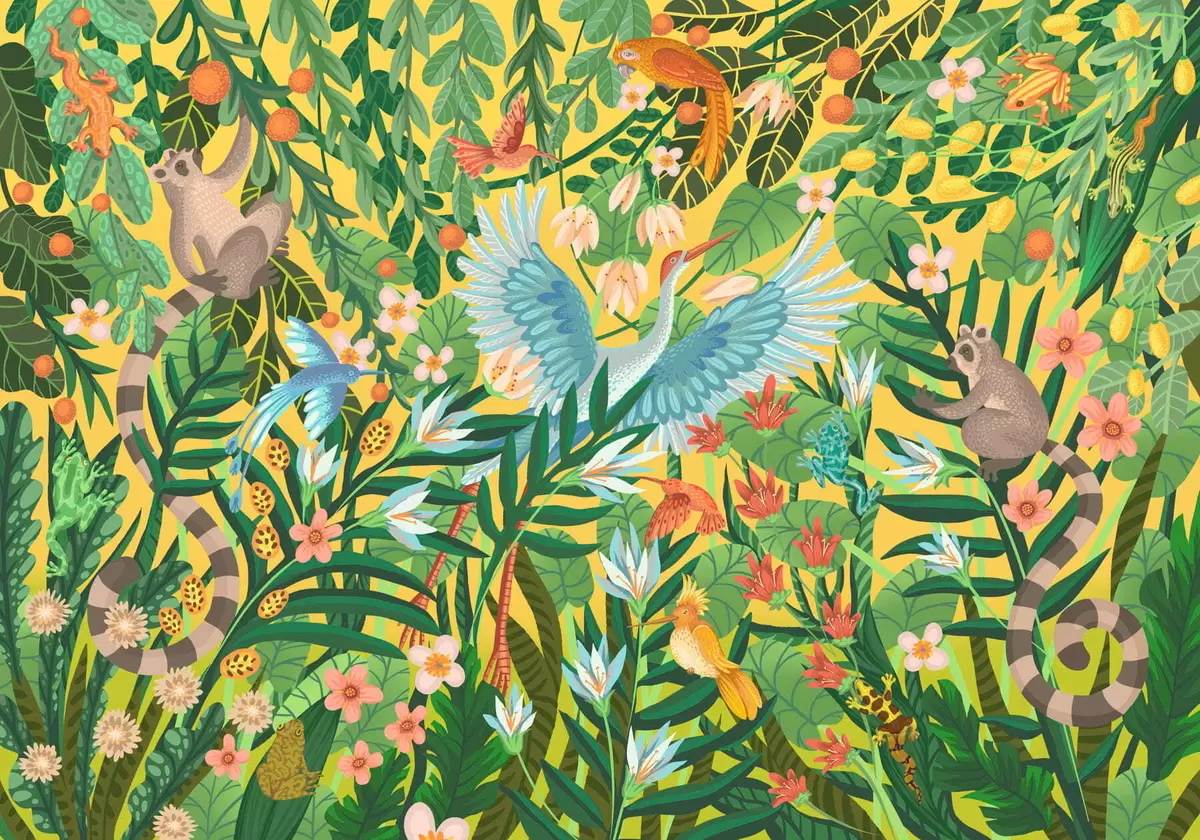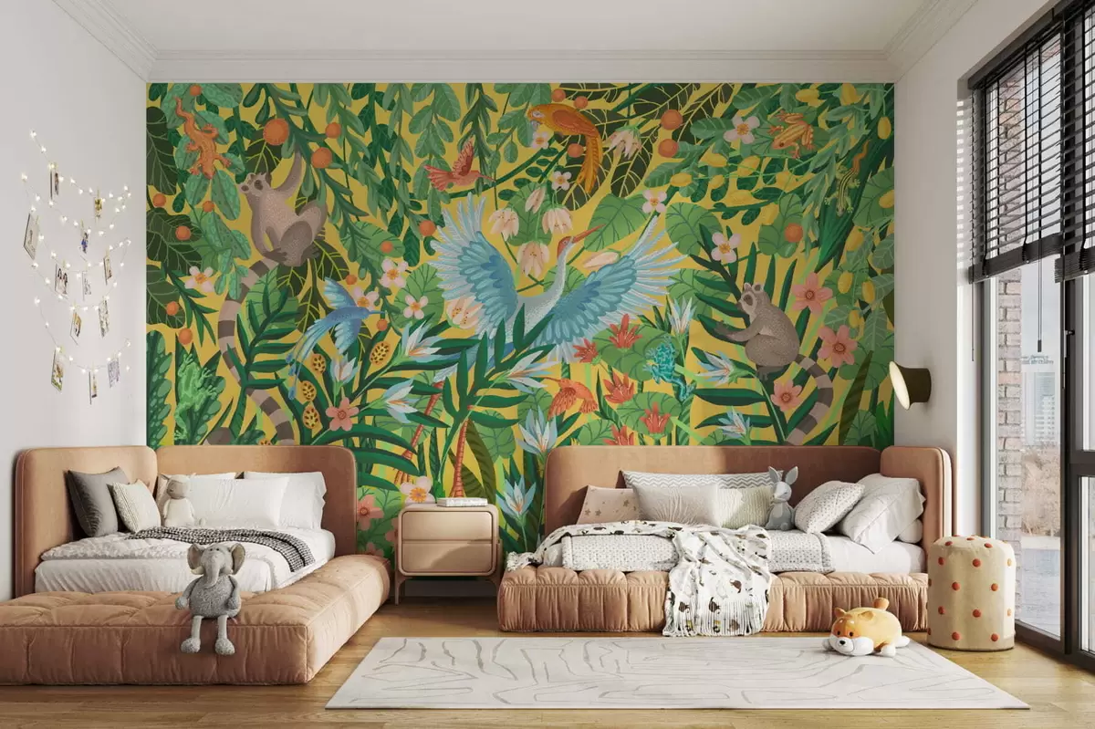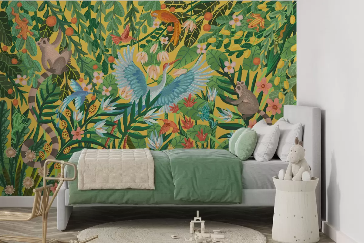 Фототапет Ярка сцена с птици и животни в гъста зеленина Nr w05024v1
