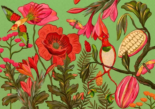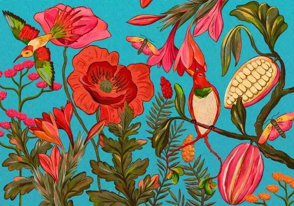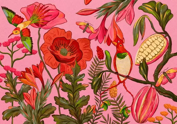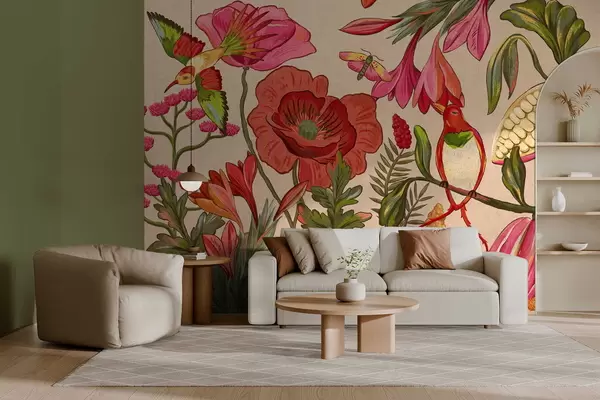 Фототапет Декоративни цветя и птици на бежов фон Nr w05036